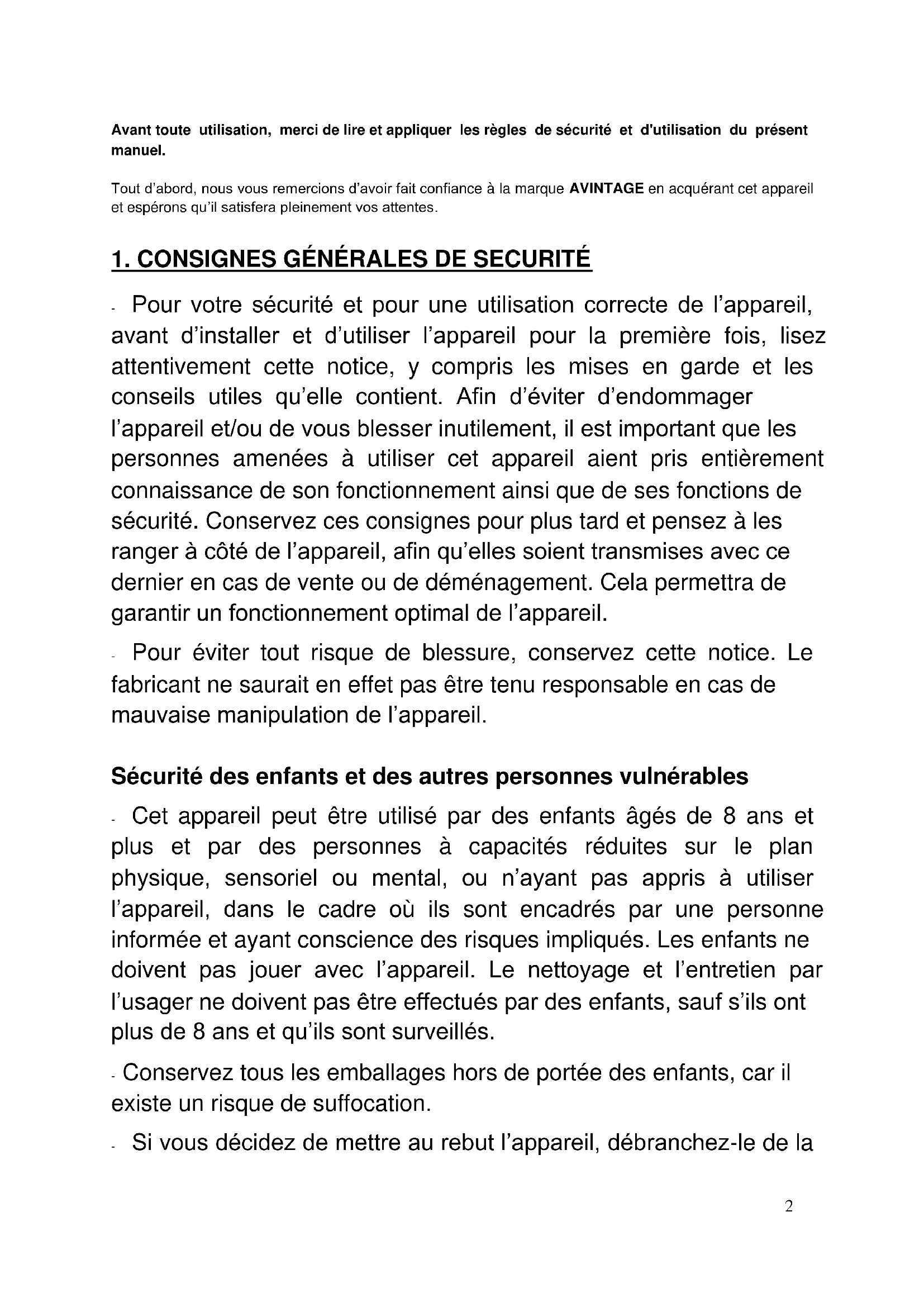 SP – MANUAL DE UTILIZACION p. 792 Avant toute utilisation, merci de lire et appliquer les règles de sécurité et d'utilisation du présent manuel. Tout d’abord, nous vous remercions d’avoir fait confiance à la marque AVINTAGE en acquérant cet appareil et espérons qu’il satisfera pleinement vos attentes.