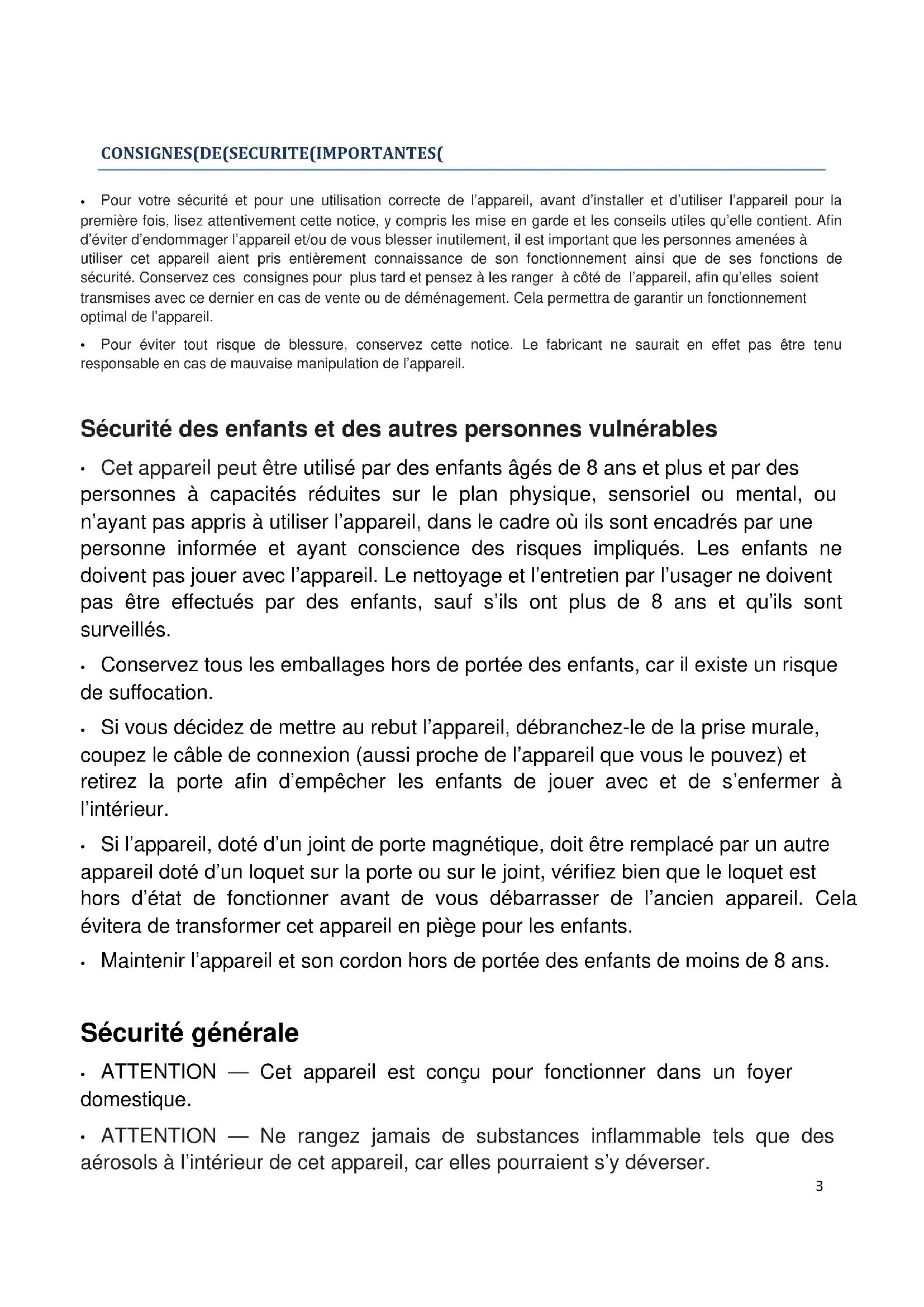 - Cet appareil peut être utilisé par des enfants âgés de 8 ans et plus et par des personnes à capacités réduites sur le plan physique, sensoriel ou mental, ou n’ayant pas appris à utiliser l’appareil, dans le cadre où ils sont encadrés par une personne informée et ayant conscience des risques impliqués. Les enfants ne doivent pas jouer avec l’appareil. Le nettoyage et l’entretien par l’usager ne doivent pas être effectués par des enfants, sauf s’ils ont plus de 8 ans et qu’ils sont surveillés.