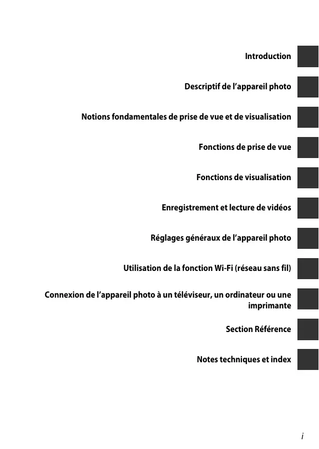 Introduction Descriptif de l’appareil photo Notions fondamentales de prise de vue et de visualisation Fonctions de prise de vue Fonctions de visualisation Enregistrement et lecture de vidéos Réglages généraux de l’appareil photo Utilisation de la fonction Wi-Fi (réseau sans fil) Connexion de l’appareil photo à un téléviseur, un ordinateur ou une imprimante Section Référence Notes techniques et index
