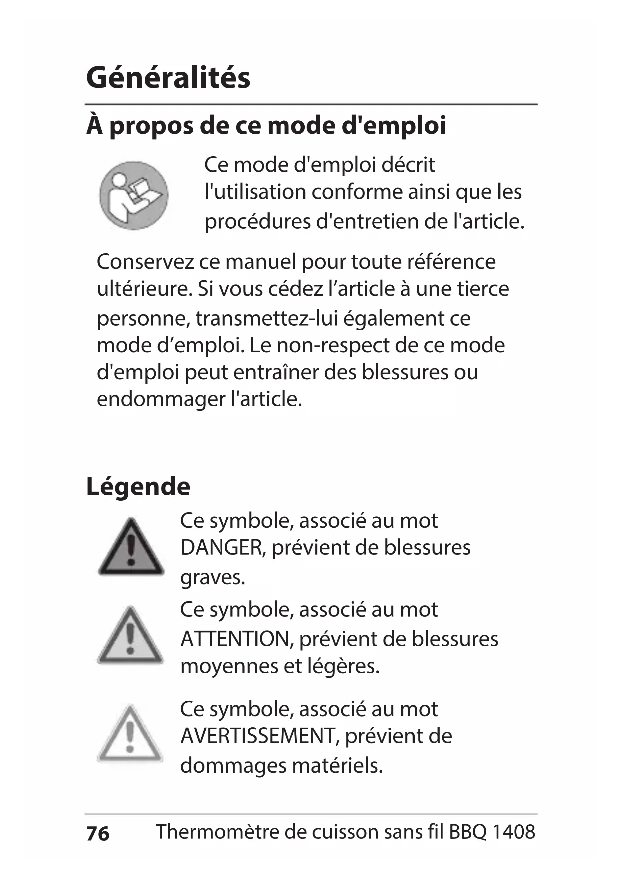 Conservez ce manuel pour toute reférence ultérieure. Si vous cédez l'article à une pierce personne, transmettez-lui également ce mode d'emploi. Le non-respect de ce mode d'emploi peut entrainer des blessures ou endommager l'article.