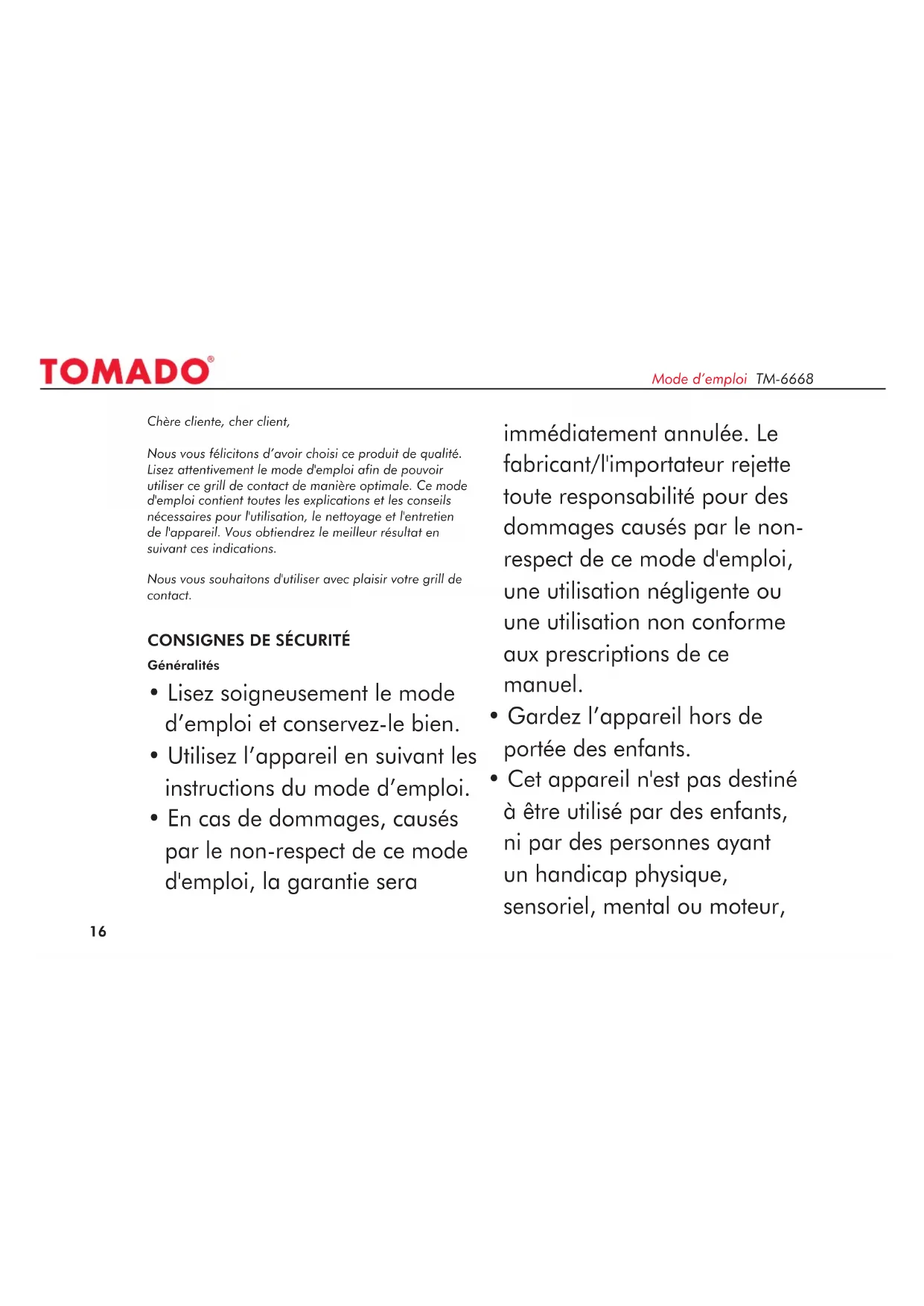 Retrouvez gratuitement la notice de l'appareil TM6668 Tomado au format PDF.