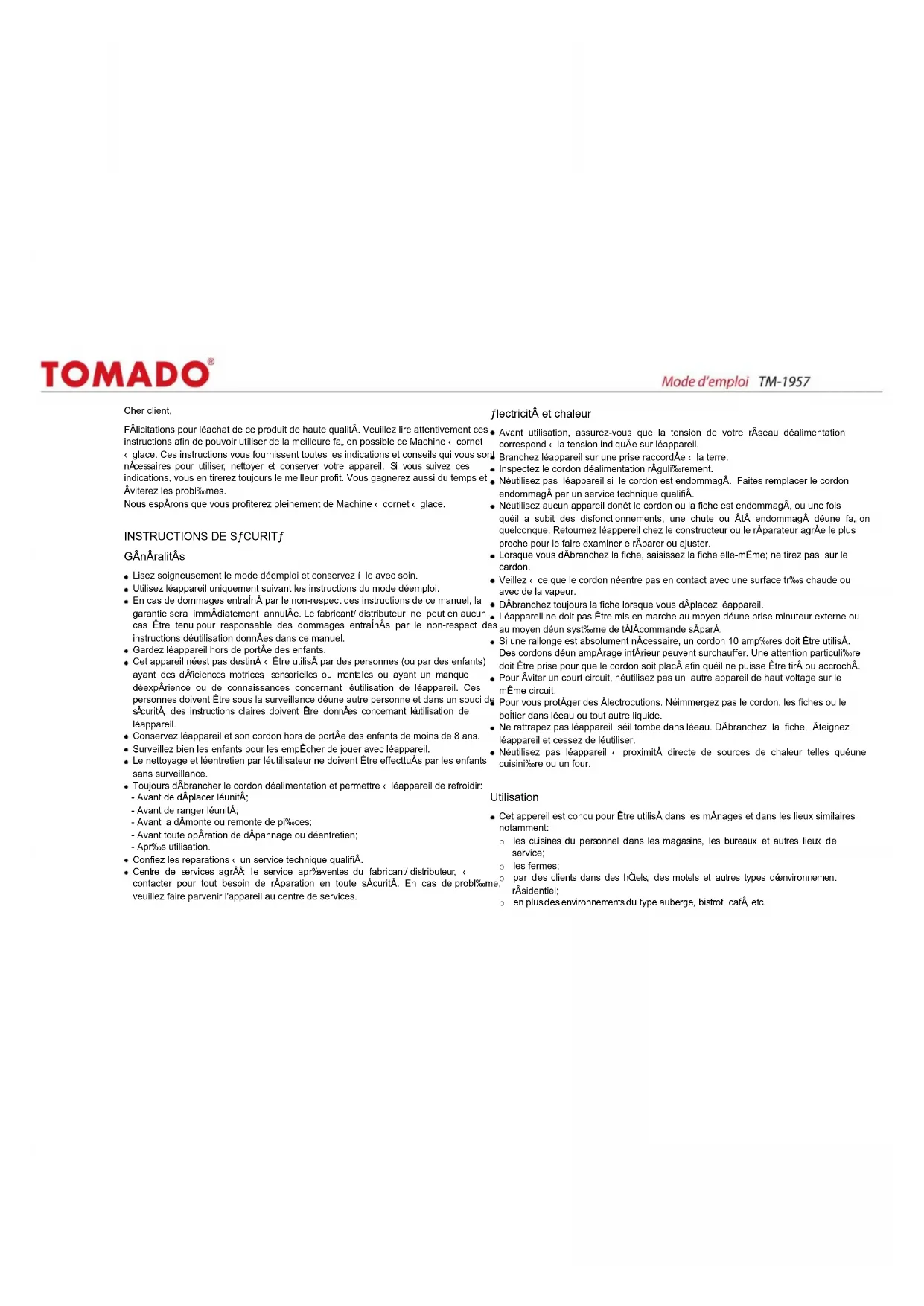 Avant de nettoyer léappareil, Âteignez-le toujours, dÂbranchez de léalimentation Âlectrique et laissez-le refroidir compl‰tement. Ne laissez pas les taches sÂcher. Nettoyez léappareil et les surfaces de cuisson d‰s que possible apr‰s utilisation. Les surfaces de cuisson internes peuvent Être nettoyÂes avec un torchon humide et de léeau ti‰de savonneuse. Essuyez les surfaces ‹ léaide déun torchon doux. Evitez déutiliser de la paille de fer, des brosses mÂtalliques, des tampons ‹ rÂcurer ou déautres objets durs pour nettoyer léappareil et les surfaces de cuisson; ceci pourrait rayer léappareil et ses surfaces anti-adhÂsives. DONNES TECHNIQUES Type nr: TM-1957 Puissance: 1200W Tension du rÂseau: 220-240V~ 50Hz Dimensions: Dimensions produit: 255 x 205 x125mm Poids net: 1.55 kgTOMADO ne peut pas être rendu responsable pour des dégâts matériels ou des accidents personnels ayant été produits par un raccordement contradictoire aux consignes de sécurités et normes techniques en vigueur sur les lieux (par exemple une prise de courant défectueuse). La garantie ne donne en aucun cas droit à un dédommagement. Toutes les autres réclamations de dommages et intérêts, dégâts inclus, sont exclues à moins que la Loi ne se prononce autrement. Les conditions de garantie autres que celles décrites ci- dessus ne seront pas reconnues par TOMADO. Service Pour toute information, vous pouvez nous écrire à l÷adresse suivante (un timbre n÷est pas nécessaire) : TOMADO Consumentenservice Antwoordnummer 19016 NL - 1000 VC Amsterdam Pays-Bas Que faire si votre appareil ne marche pas ? Si votre appareil présente des défauts, vous pouvez vous adresser à votre commerçant. Votre commerçant fera en sorte que ces défauts soient réparés le plus rapidement possible. Réparations qui ont lieu après la période de garantie Ces réparations sont toujours possibles. Il va de soit que ces réparations seront payantes. Nous vous félicitons de votre achat de cet appareil de l÷assortiment TOMADO. Conditions de garantie TOMADO donne 2 ans de garantie sur toutes les défaillances résultant de défauts cachés et mettant l÷appareil hors d÷usage pour une utilisation normale. La garantie prend effet au moment de l÷achat; conservez donc soigneusement votre preuve d÷achat. Pendant cette période de garantie, vous aurez la possibilité de faire réparer gratuitement les éventuels défauts de fabrication et / ou défauts de matériaux, de remplacer certaines pièces ou d÷échanger votre friteuse. Le certificat de garantie doit être rempli, au moment de l÷achat, par celui ou celle qui vend l÷appareil. La réparation ne sera effectuée que si vous pouvez prouver que le jour de votre réclamation se trouve encore dans la période de garantie (par exemple carte de garantie dûment remplie accompagnée de la preuve d÷achat correspondante). La garantie n÷est pas valable si le défaut a été causé par un dégât suite à un accident, par une mauvaise utilisation, une négligence (par exemple, mauvais nettoyage), ou si des interventions ou réparations ont été faites autre part que dans un atelier de service TOMADO (à l÷exception du démontage, comme indiqué dans le mode d÷emploi). De même, la garantie ne sera plus valable si vous branchez votre friteuse sur une mauvaise tension réseau, si vous ne suivez pas le mode d÷emploi et en cas d÷usure normale de l÷appareil. La garantie ne couvre pas non plus les dégâts causés en cas de détartrage non fait à temps sur l÷appareil, quelle que soit l÷eau utilisée (ce qui est aussi le cas pour les fers à repasser à vapeur, les machines à café et les bouilloires électriques). Conditions de garantieDear Customer, Congratulations on your purchase of this high-quality product. Read these instructions carefully, so that you can make the best use of this ice cone maker, these instructions give you all the necessary directions and advice for using, cleaning and maintaining the appliance. If you follow these instructions, you will always get the best result from the appliance. You will also save time and avoid any problems. We hope that you will enjoy using this ice cone maker. SAFETY INSTRUCTIONS General Information Read these instructions carefully and keep them in a safe place. Only use the appliance as described in this manual. In case of damage caused by failure of not living up to this manual the warranty will decay immediately. The manufacturer/ importer accepts no liability for damages caused by failure to not living up the manual, a negligent use or use not in accordance with the requirements of this manual. Keep the appliance out of the reach of children. This appliance is not intended for use by persons (including children) when reduced physical, sensory or mental capabilities, or lack of experience and knowledge, unless they have been given supervision or instruction concerning use of the appliance by a person responsible for their safety. Keep the appliance and its cord out of reach of children less than 8 years. Children must be strictly supervised to prevent them from treating the appliance as a toy. Cleaning and user maintenance shall not be made by children without supervision. Always remove the power cord and let it cool: - Before moving the unit; - Before the unit is stored; - Before you go mounting or dismantle parts; - Before cleaning or maintenance work; - After use. Only have the appliance repaired by a qualified service centre. Qualified service center: after-sales service of the manufacturer/ importer, which is qualified to carry out repair to avoid any kind of danger. In case of problems please return the appliance to this service.