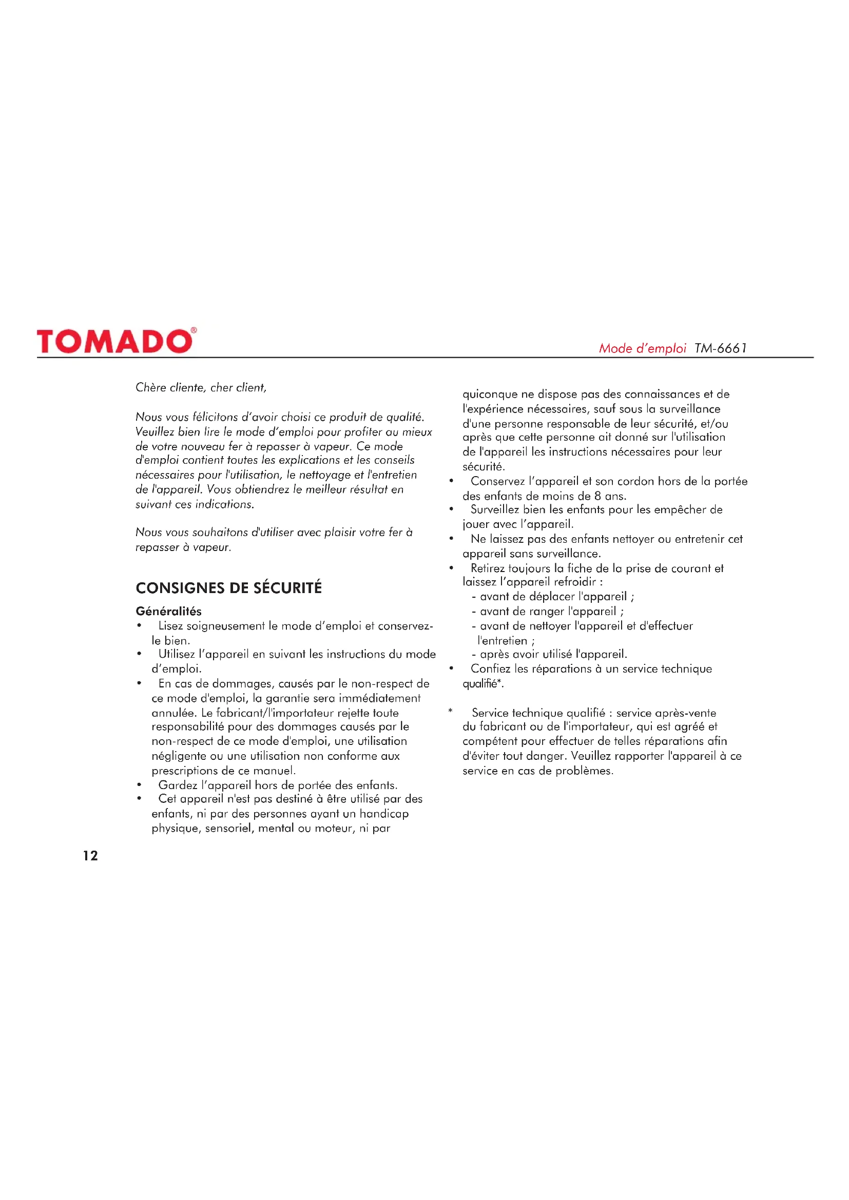 TM6661 - Fer à repasser Tomado - Notice d'utilisation et mode d'emploi gratuit