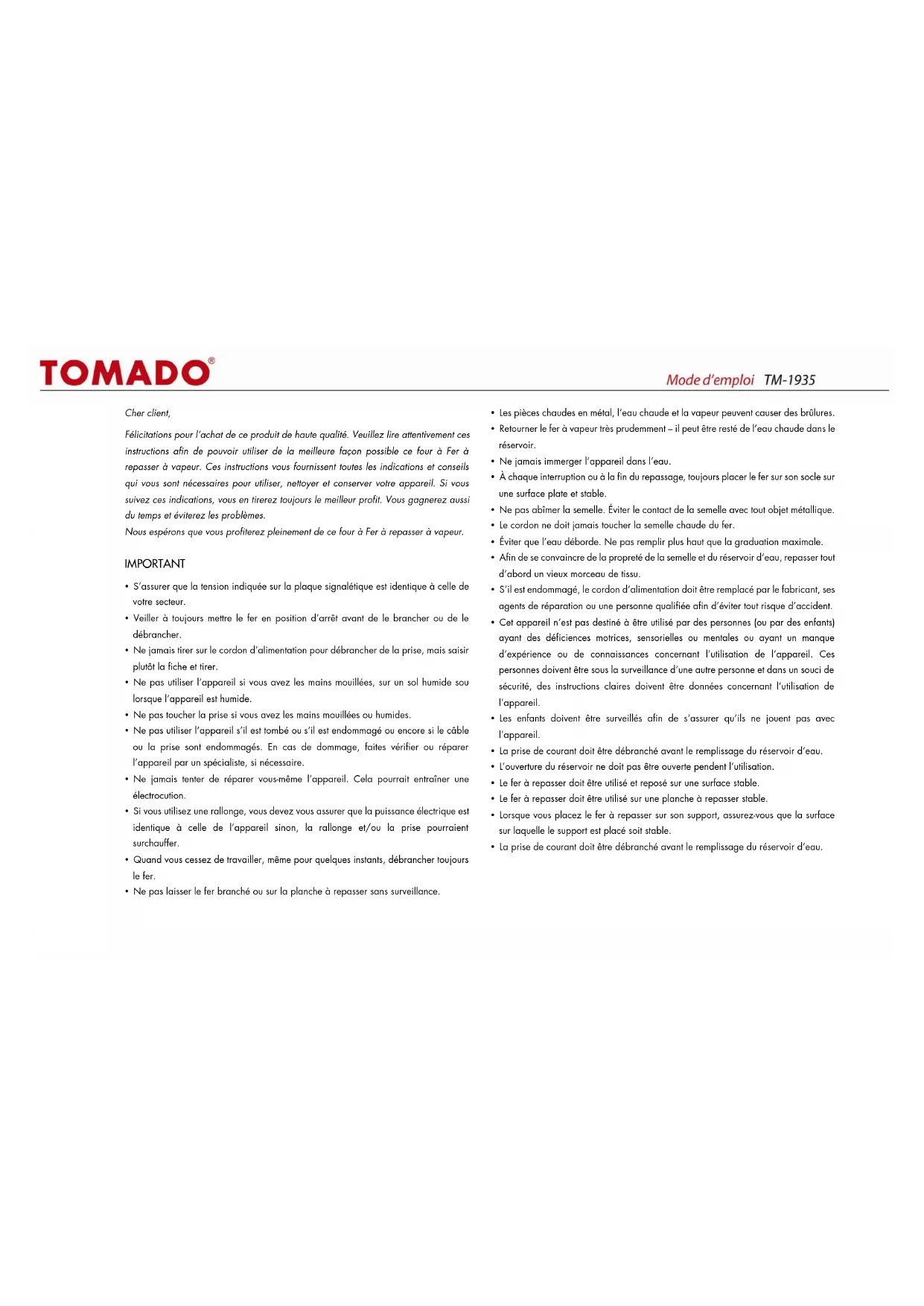 TM1935 - Fer à repasser Tomado - Notice d'utilisation et mode d'emploi gratuit