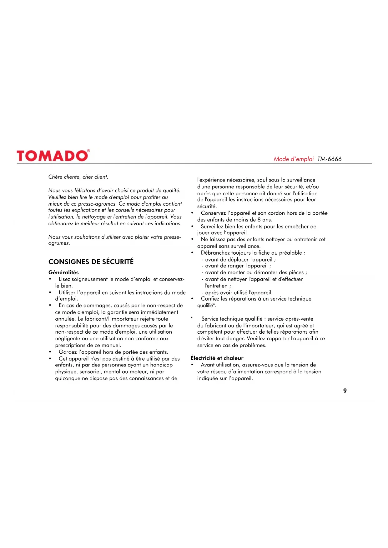 TM6666 - Extracteur de jus Tomado - Notice d'utilisation et mode d'emploi gratuit