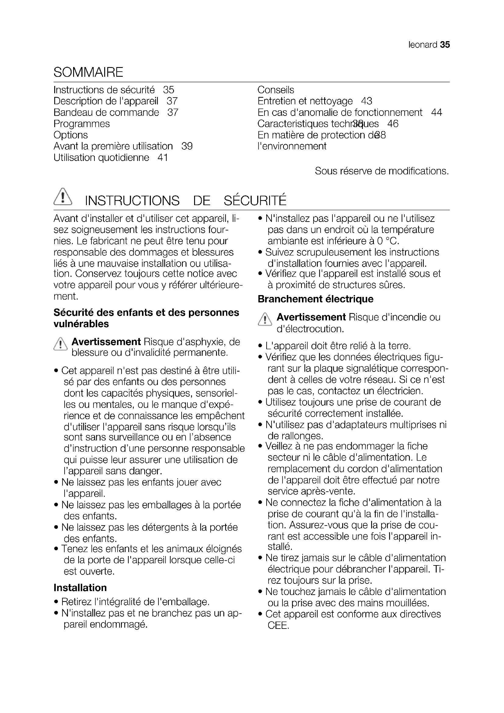 34 leonardSOMMAIRE Instructions de sécurité 35 Description de l'appareil 37 Bandeau de commande 37 Programmes 38 Options 38 Avant la première utilisation 39 Utilisation quotidienne 41 Conseils 42 Entretien et nettoyage 43 En cas d'anomalie de fonctionnement 44 Caracteristiques techniques 46 En matière de protection de l'environnement 46 Sous réserve de modifications.