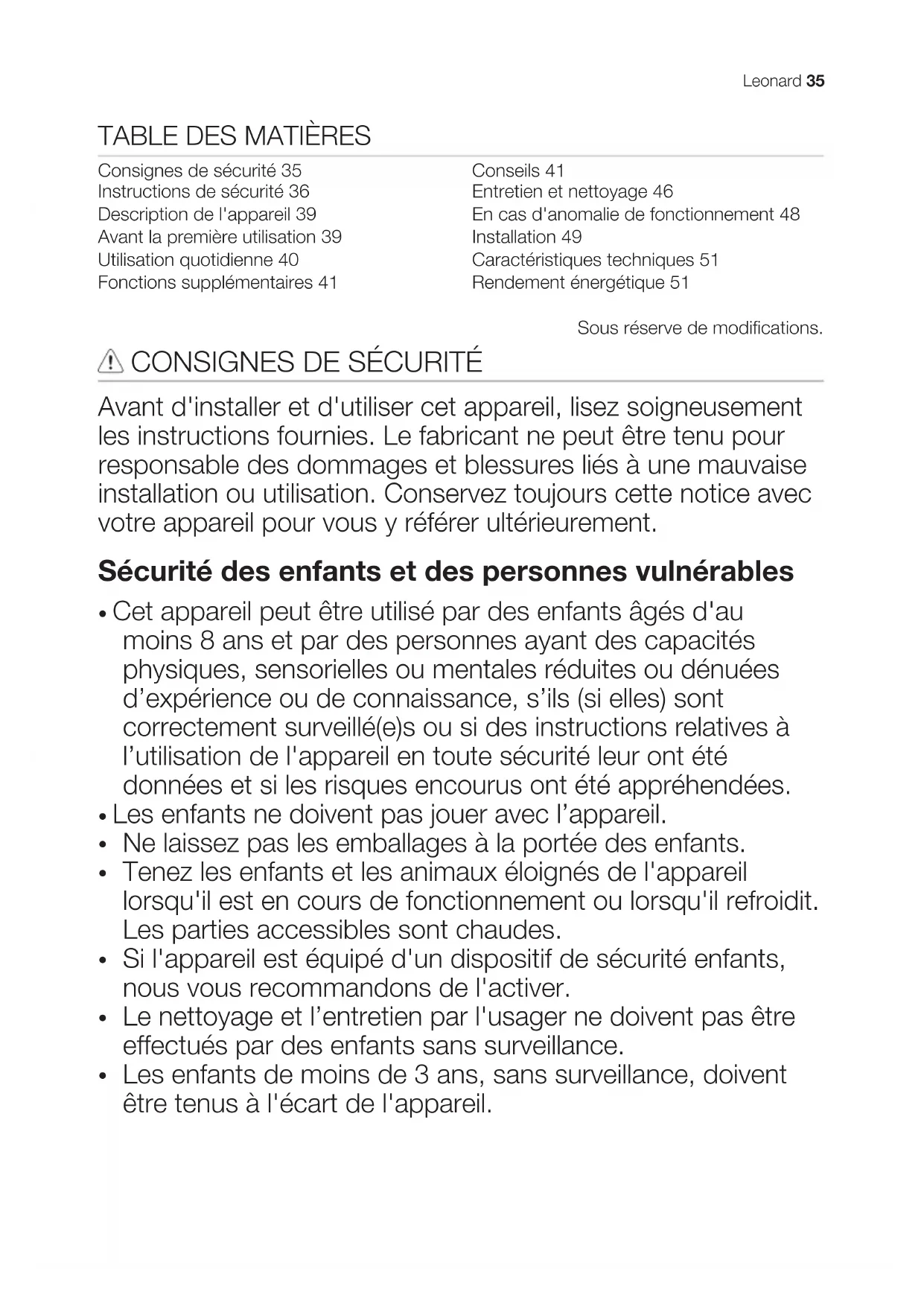 - Si l'appareil est équipé d'un dispositif de sécurité enfants, nous vous recommandons de l'activer.