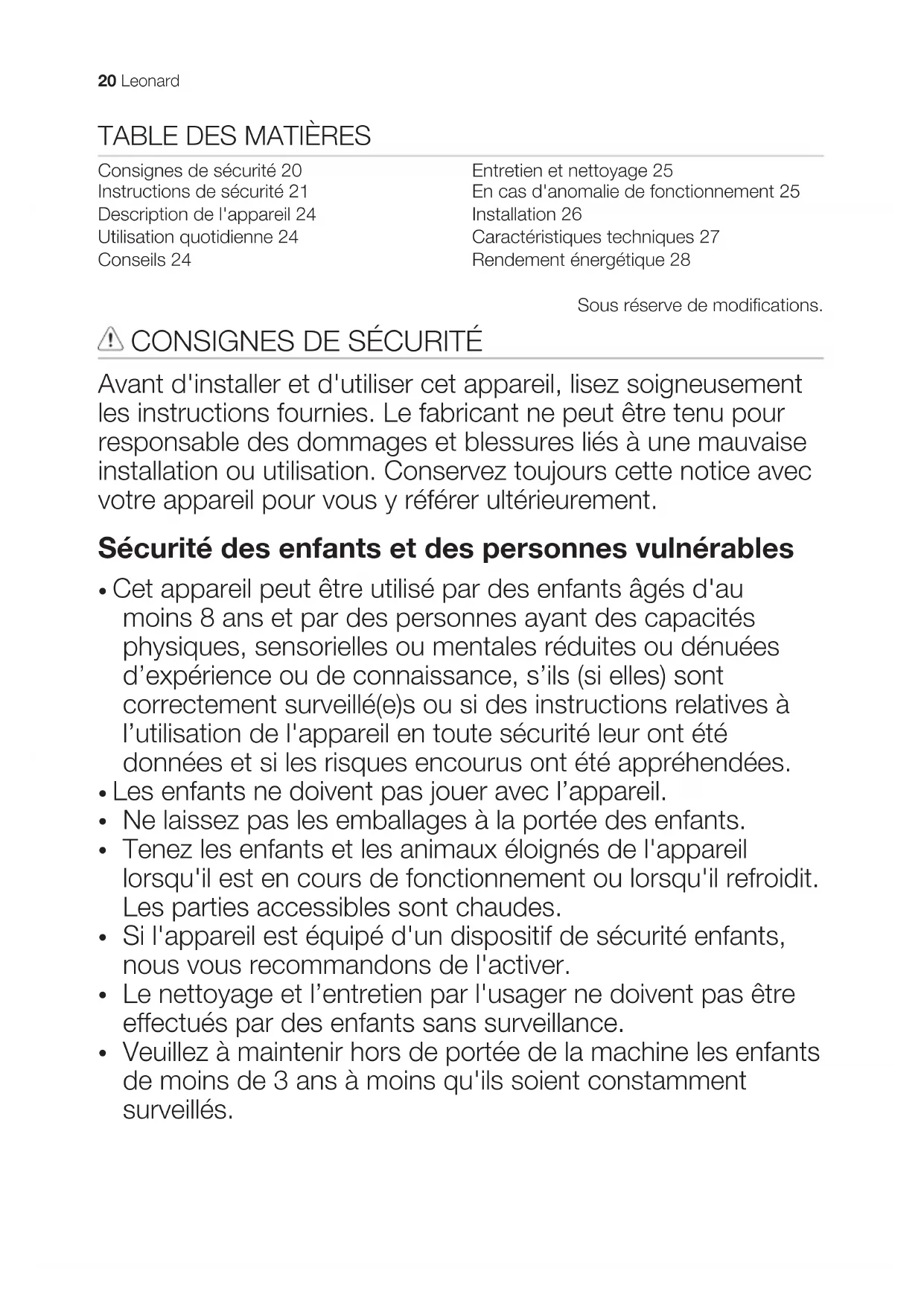 Veuillez à maintenir hors de portée de la machine les enfants de moins de 3 ans à moins qu'ils soient constamment surveillés. 20 LeonardSécurité générale