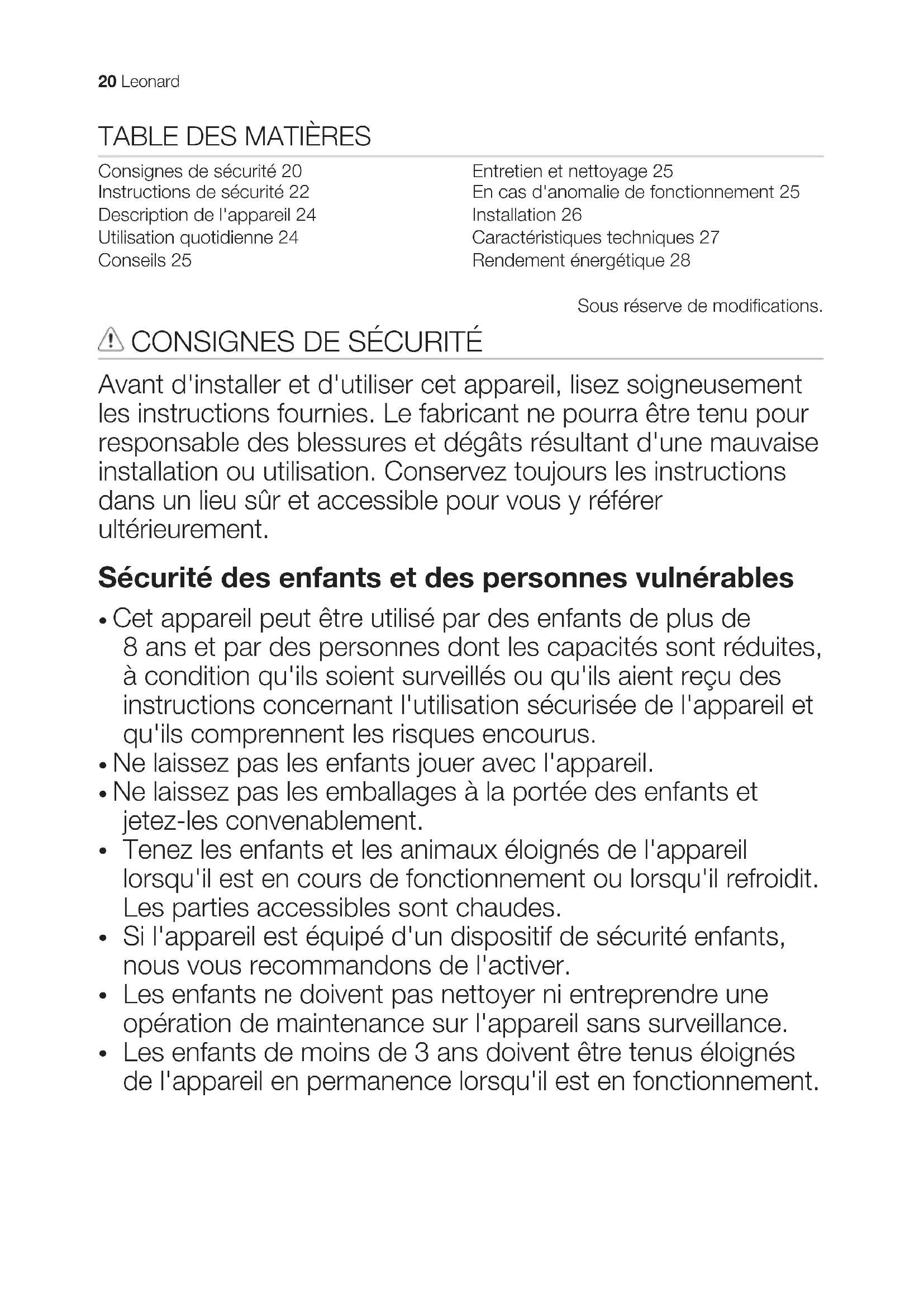 Les enfants de moins de 3 ans doivent être tenus éloignés de l'appareil en permanence lorsqu'il est en fonctionnement. 20 LeonardSécurité générale