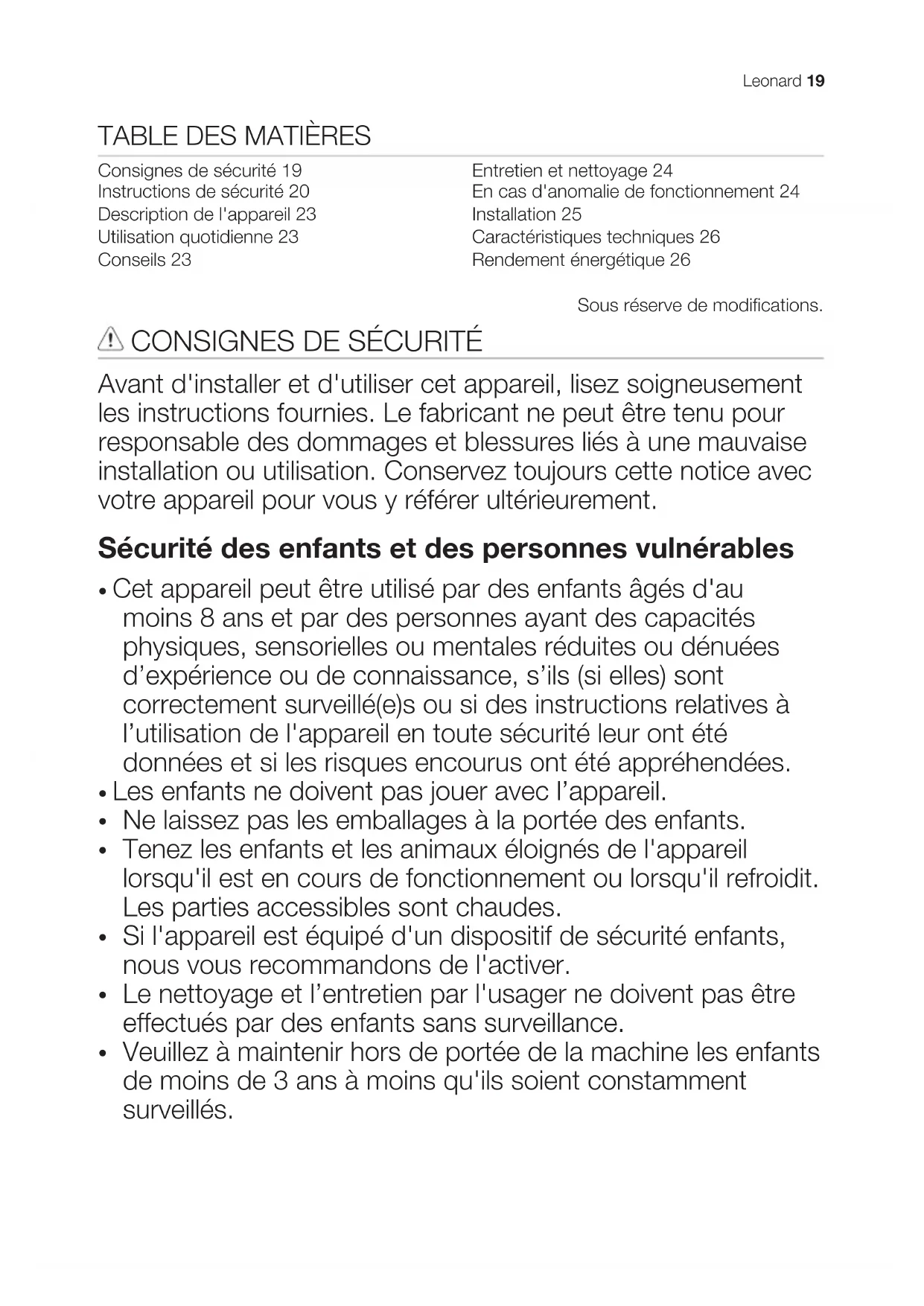 Veuillez à maintenir hors de portée de la machine les enfants de moins de 3 ans à moins qu'ils soient constamment surveillés. Leonard 19Sécurité générale