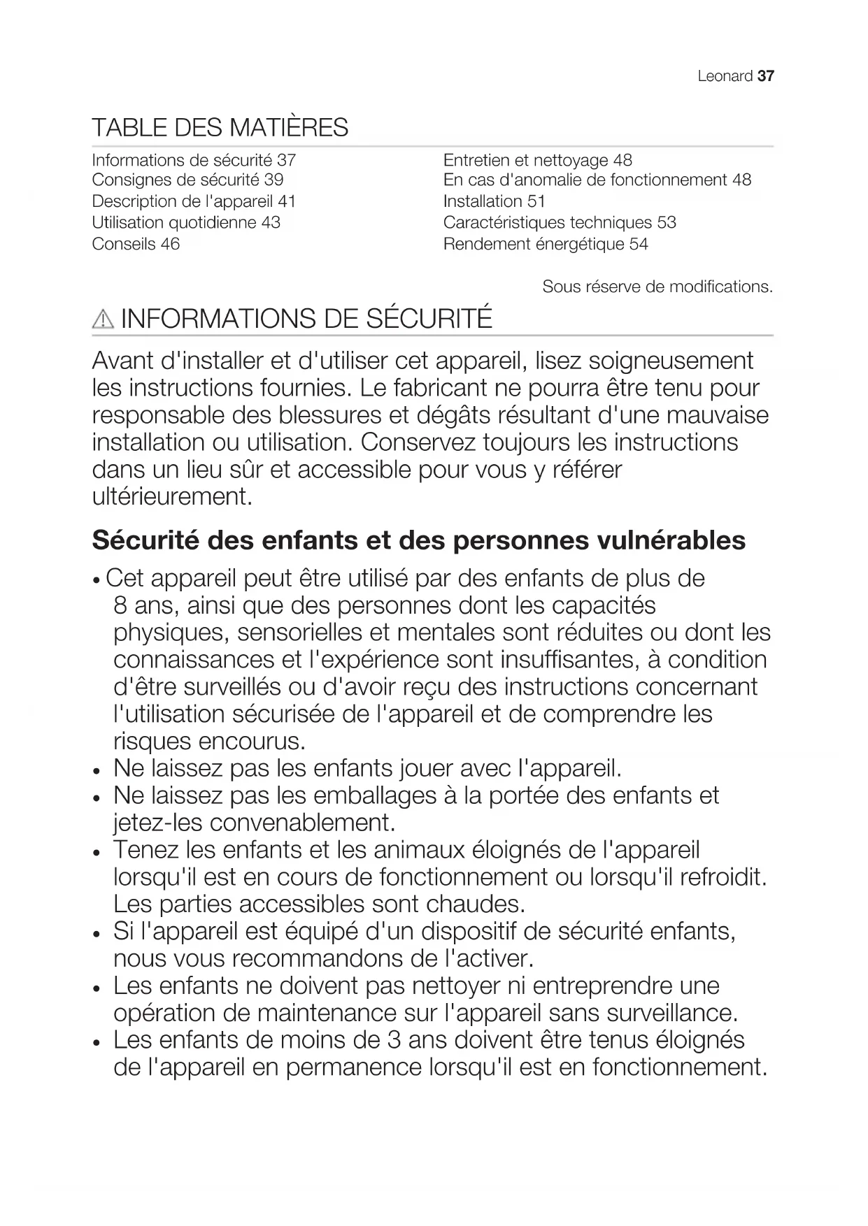 - Si l'appareil est équipé d'un dispositif de sécurité enfants, nous vous recommendons de l'activer.
