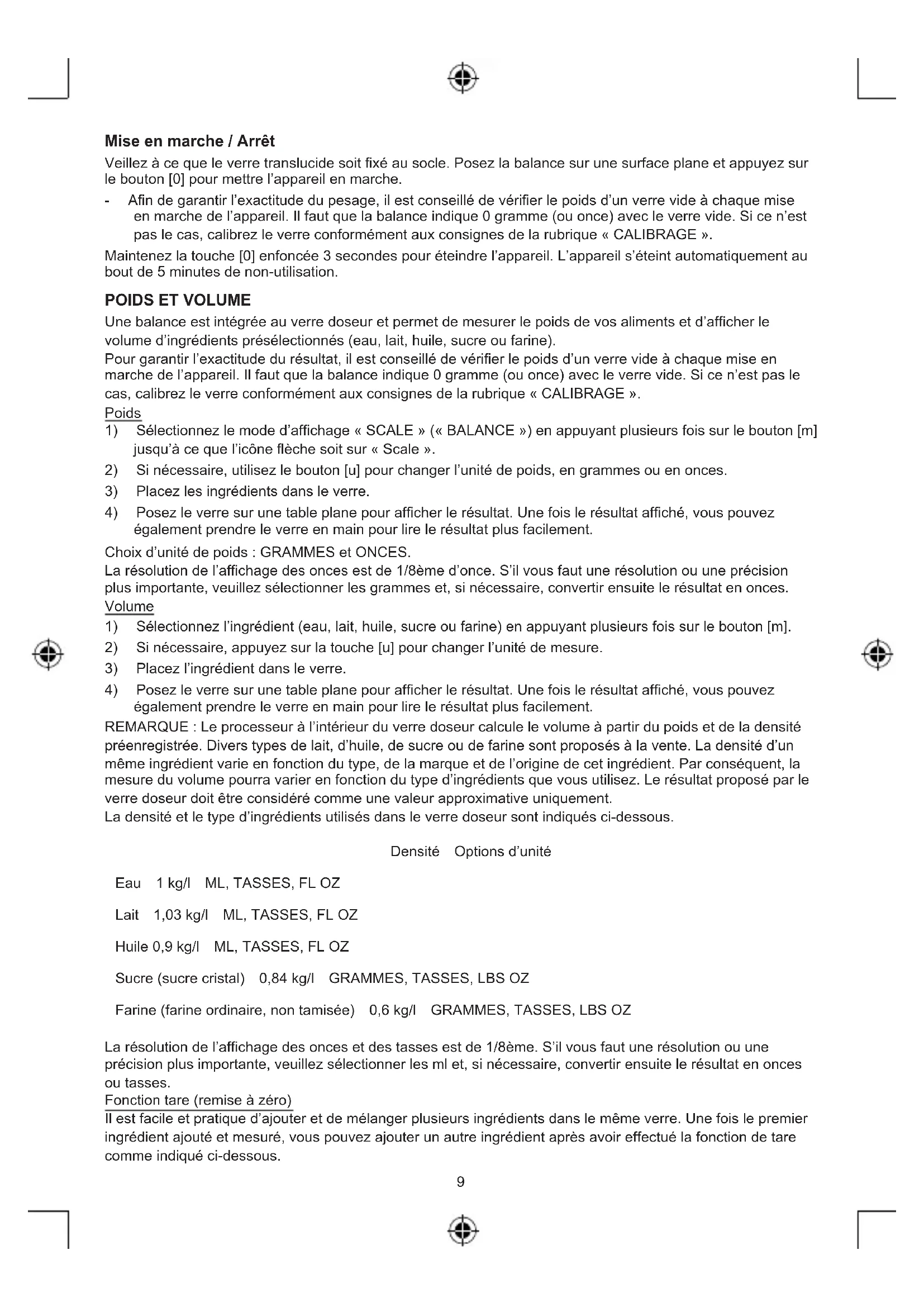 également prendre le verre en main pour lire le résultat plus facilement. REMARQUE:Leprocesseuràl’intérieurduverredoseurcalculelevolumeàpartirdupoidsetdeladensité préenregistrée.Diverstypesdelait,d’huile,desucreoudefarinesontproposésàlavente.Ladensitéd’un mêmeingrédientvarieenfonctiondutype,delamarqueetdel’originedecetingrédient.Parconséquent,la mesureduvolumepourravarierenfonctiondutyped’ingrédientsquevousutilisez.Lerésultatproposéparle verredoseurdoitêtreconsidérécommeunevaleurapproximativeuniquement. Ladensitéetletyped’ingrédientsutilisésdansleverredoseursontindiquésci-dessous. Densité Optionsd’unité Eau 1kg/l ML,TASSES,FLOZ Lait 1,03kg/l ML,TASSES,FLOZ Huile 0,9kg/l ML,TASSES,FLOZ Sucre(sucrecristal) 0,84kg/l GRAMMES,TASSES,LBSOZ Farine(farineordinaire,nontamisée) 0,6kg/l GRAMMES,TASSES,LBSOZ Larésolutiondel’afchagedesoncesetdestassesestde1/8ème.S’ilvousfautunerésolutionouune précision plus importante, veuillez sélectionner les ml et, si nécessaire, convertir ensuite le résultat en onces ou tasses. Fonctiontare(remiseàzéro) Ilestfacileetpratiqued’ajouteretdemélangerplusieursingrédientsdanslemêmeverre.Unefoislepremier ingrédientajoutéetmesuré,vouspouvezajouterunautreingrédientaprèsavoireffectuélafonctiondetare commeindiquéci-dessous.10 - Posez le verre contenant le premier ingrédient sur une table plane. - Appuyezunefoissurlebouton[0].Lerésultatafchéseremetàzéroetl’icône«TARE»s’afcheen haut de l’écran. Vouspouvezalorsajouterl’autreingrédient.Seullepoidsoulevolumedudernieringrédientestalorscalculé. Pourajouterd’autresingrédients,procédezdelamêmemanière. REMARQUE:Lafonctiondetarenemarchecorrectementquesileverrereposesurunesurfaceplane. Annulation de la fonction tare Justeaprèsavoirutilisélafonctiontare,unefoisquel’écranafche«0»etquel’icône«TARE»estapparue, vouspouvezappuyersurlebouton[0]pourreveniraurésultatdepoidsoudevolumeafchéjusteavant d’avoirutilisélafonctiontare.L’icône«TARE»disparaît. REMARQUE:Lafonctiond’inversiondetarenemarchecorrectementquesileverrereposesurunesurface plane. MÉLANGEUR(REMARQUEIMPORTANTE) Ilestfacileetpratiquedemélangerdifférentsingrédientsdansleverredoseur.Ilpeutcontenirjusqu’à5Kg dechargemaximale.Silepoidsetlachargetotalelorsdumélangesontsupérieursà5kg,l’unitéémettraun signalsonoreetafcheralemessage«Err».Assurez-vousdesupprimerlasurchargedepoidsetd’arrêter immédiatement la fonction de mélange. Lesélémentssensiblesdemesuredupoidssontsituésdanslabasedelabalanceetunepressionetunpoids excessif exercés sur la base peuvent endommager de façon permanente l’intérieur de la balance et fournir une lecture non correcte. Pour prolonger la durée de vie de l’appareil, veuillez déposer le verre doseur et mélanger les ingrédients dans lerécipientséparédesabasequandlachargeestprochede,ousupérieurà5kg.