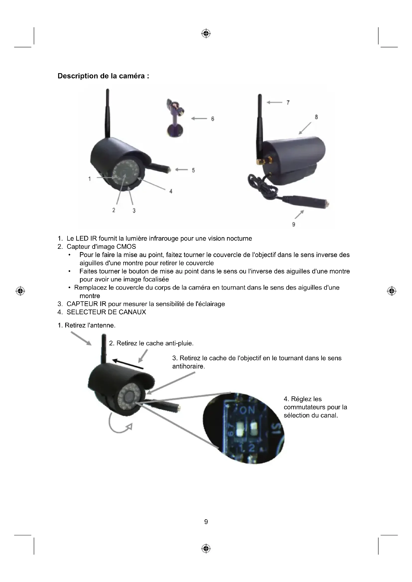 et WiFi. Le caméra couleur est équipé d'un boîtier étanche et elle peut être utilisée aussi bien à l'intérieur qu'à l'extérieur. Les LED IR permettent à la caméra de fournir une image claire même dans l'obscurité et avec le micro intégré vous pouvez entendre ce qui se passe. Elle fonctionne jusqu'à 100 m en plein air et 30 m à l'intérieur.9 Description de la caméra :