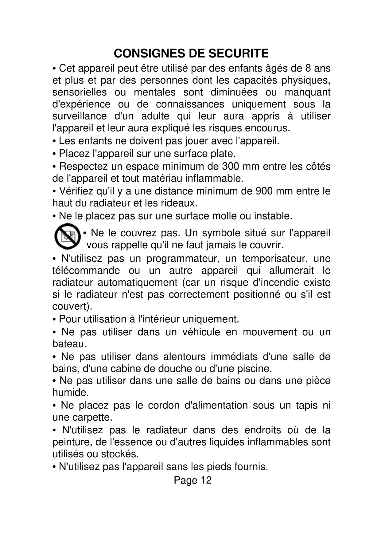- N'utilisez pas un programmateur, un temporisateur, une télécommande ou un autre appareil qui allumerait le radiateur automatiquement (car un risque d'incendie existe si le radiateur n'est pas correctement positionné ou s'il est couvert).