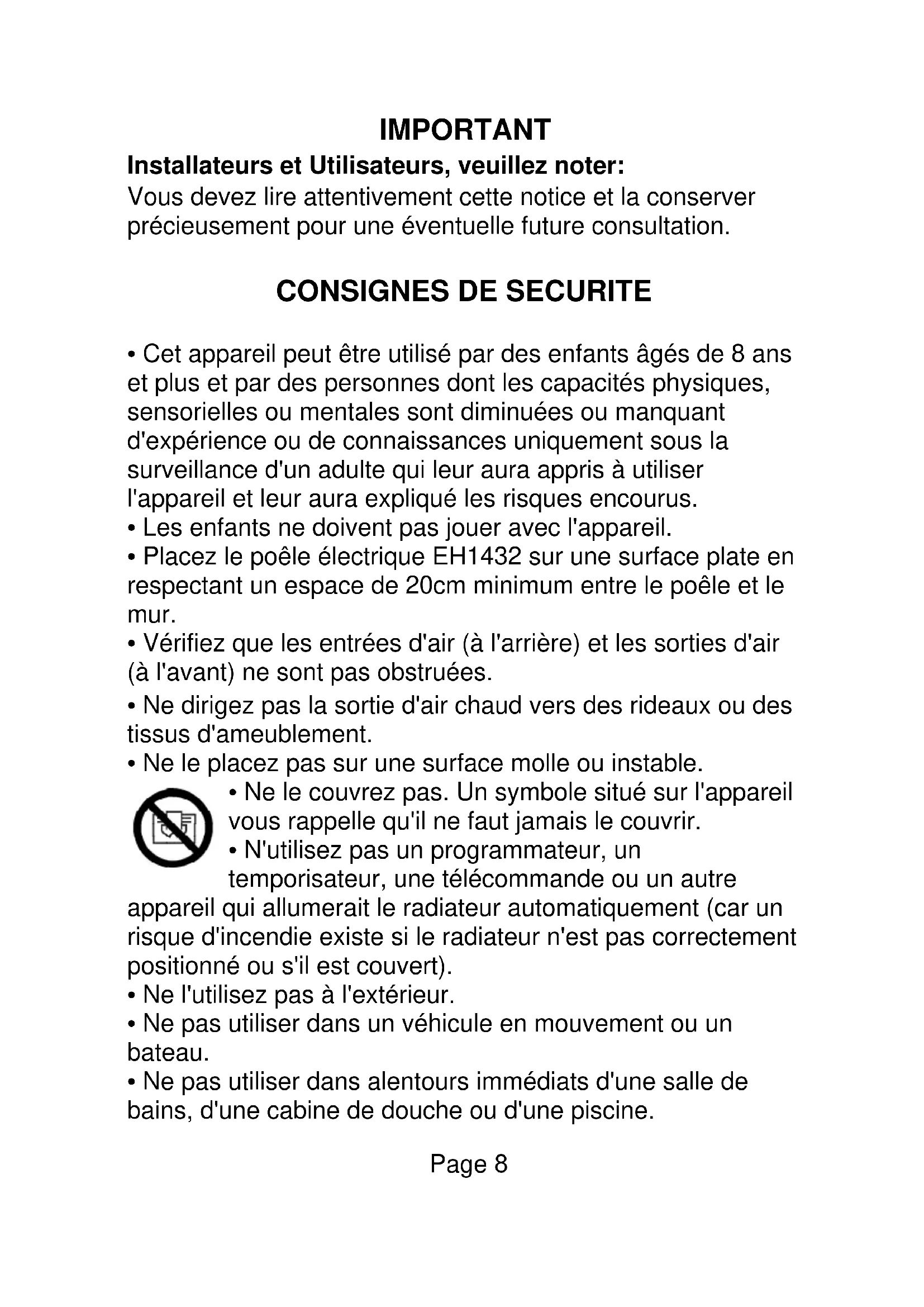 - N'utilisez pas un programmateur, un temporisateur, une télécommande ou un autre appareil qui allumerait le radiateur automatiquement (car un risque d'incendie existe si le radiateur n'est pas correctement positionné ou s'il est couvert).