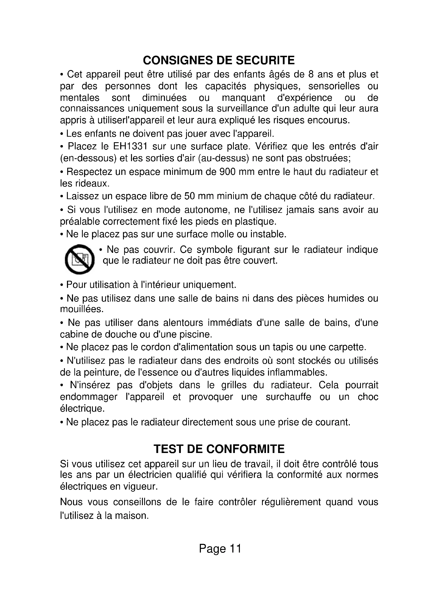Si vous utilisez cet appareil sur un lieu de travail, il doit être contrôlé tous les ans par un électricien qualifié qui vérifiera la conformité aux normes électriques en vigueur. Nous vous conseillons de le faire contrôler régulièrement quand vous l'utilisez à la maison. Page 11EXIGENCES GENERALES DE SECURITE Le câblage électrique domestique doit être vérifié régulièrement par un électricien qualifié, au minimum tous les 10 ans ou à chaque changement d'occupant. Pour les bureaux, commerces et bâtiments comme la maison du village ou salle des fêtes, le câblage doit être contrôlé tous les 5 ans. Il est conseillé d'équiper les bâtiments de détecteurs de fumée (ceci est obligatoire pour les nouveaux bâtiments). FONCTIONNEMENT Branchez l'appareil dans une prise murale. Si vous utilisez une rallonge, vérifiez que le câble est calibré à 13 A mpères et que la rallonge est complètement déroulée. Utilisez le bouton de contrôle de puissance à 2 touches pour sélectionner le mode de fonctionnement souhaité :