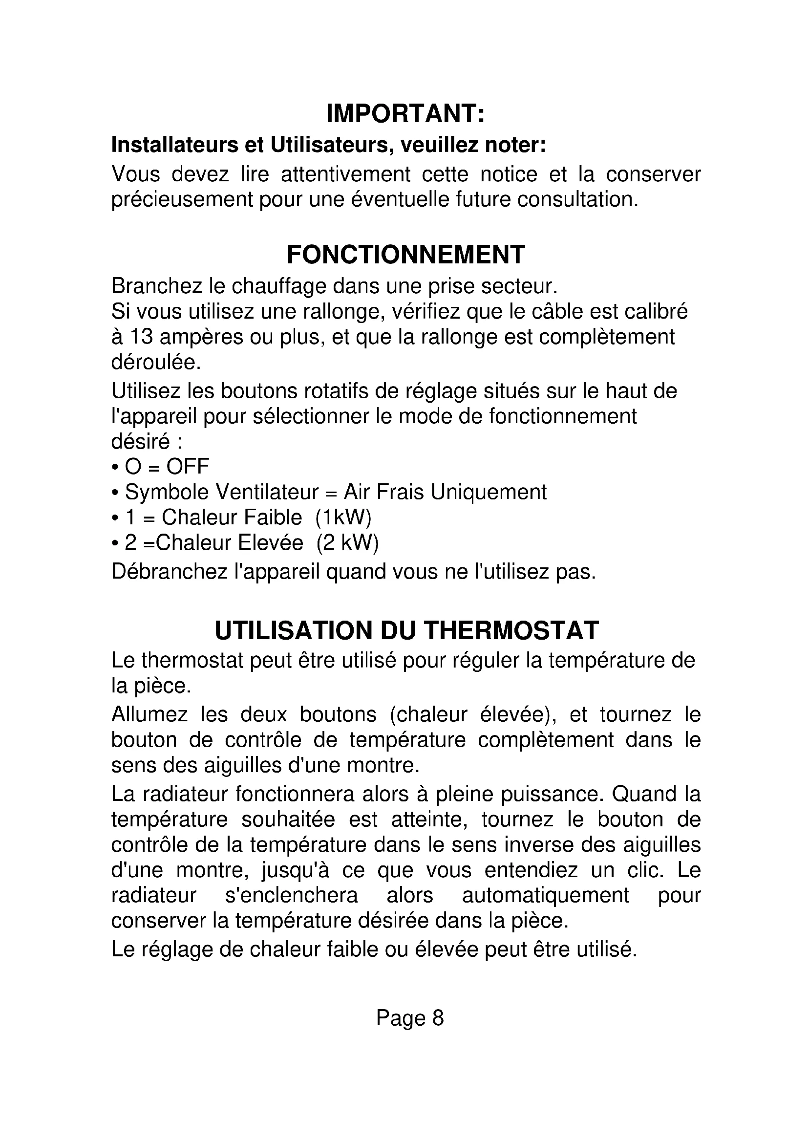 Le thermostat peut être utilisé pour réguler la température de la pièce. Allumez les deux boutons (chaleur élevée), et tournez le bouton de contrôle de température complètement dans le sens des aiguilles d'une montre. La radiateur fonctionnera alors à pleine puissance. Quand la température souhaitée est atteinte, tournez le bouton de contrôle de la température dans le sens inverse des aiguilles d'une montre, jusqu'à ce que vous entendiez un clic. Le radiateur s'enclenchera alors automatiquement pour conserver la température désirée dans la pièce. Le réglage de chaleur faible ou élevée peut être utilisé. Page 8CONSIGNES DE SECURITE