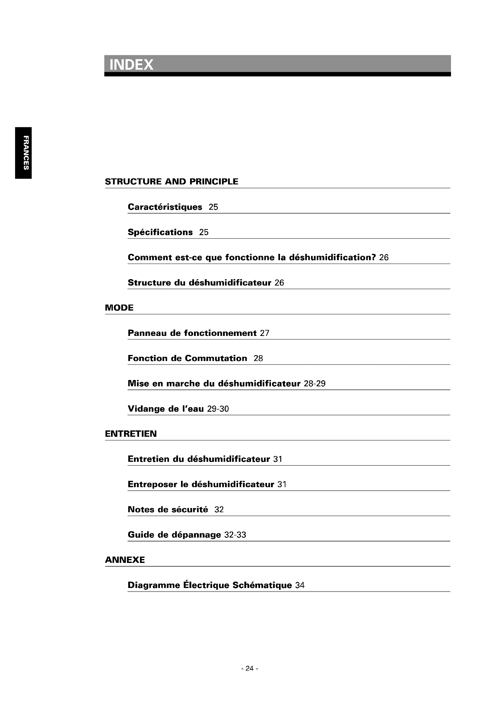 agents de service ou par une personne qualifiée afin d'éviter tout danger. When use the unit, please observe the following safety precautions: Entretien ● Notes de sécurité Si une des situations décrites ci-dessous apparaît, veuillez vérifier les points suivants pour éviter de per- dre du temps et de l’argent. Entretien ● Guide de dépannage Condition Cause Que faire ? L’unité ne fonctionne pas. Est-ce que le câble d’ali- mentation a été débranché ? Est-ce que la température de la pièce est supérieure à 38ºC ou inférieure à 2ºC ? Veuillez brancher le cordon d’alimenta- tion dans la prise. Veuillez vider l’eau du réservoir de vidange, puis le remettre en place. Le mécanisme de protection est activé et l’unité ne peut se mettre marche, car les conditions ne sont pas bonnes (dans ce cas, veuillez ne pas utiliser le déshumidificateur.) Est-ce que le voyant “ ” clignote ? (Le réservoir est plein ou mal positionné.)FRANCES Entretien La fonction de déshumidification ne fonctionne pas. Est-ce que le filtre à air est obstrué ? Est-ce que les orifices d’entrée ou de sortie d’air sont obstrués ? Veuillez nettoyer le filtre à air comme indiqué dans la rubrique “Entretien du déshumidificateur”. Veuillez retirer ce qui obstrue les orifi- ces d’entrée ou de sortie d’air. L’air n’est pas expulsé. Est-ce que le filtre à air est obstrué ? Veuillez nettoyer le filtre à air comme indiqué dans la rubrique “Entretien du déshumidificateur”. Le fonctionnement est bruyant. Est-ce que l’unité a été insta- llée de manière incorrecte ? Est-elle inclinée ou instable ? Est-ce que le filtre à air est obstrué? Veuillez place l’unité sur une surface stable et solide. Solution: Mettez un coussinet sous l’u- nité afin de réduire le bruit. Veuillez nettoyer le filtre à air comme indiqué dans la rubrique “Entretien du déshumidificateur”. ● Si après avoir effectué les étapes correspondant aux pannes décrites ci-dessus, la panne ne peut pas être réparée ou si d’autres pannes apparaissent, veuillez contacter un centre de service autorisé. Les symptômes suivants n’indiquent pas une panne Entretien ● Guide de dépannage Symptôme Cause Le bruit augmente soudainement pen- dant le fonctionnement Le niveau sonore de l’unité augmente avec la mise en route du compresseur. La déshumidification est très faible ou inexistante. Cela peut arriver lorsque la température et/ou l’humidité de la pièce sont trop basses. Lorsque l’unité est utilisée pour la pre- mière fois, l’air expulsé sent le moisi. Parce que la température de la tête d’échange thermique monte soudainement, une odeur inhabituelle ou une odeur de moisi peut apparaître pendant un moment. L’humidité ne baisse pas. Est-ce que la pièce est trop grande pour l’unité ? Est-ce que les portes et les fenêtres sont ouvertes et fermées fréquemment ? Y a-t-il un appareil dans la pièce comme un chauffage à kérosène par exemple, qui émet de la vapeur ? - 33 -Au démarrage de l’unité ou au cours d’un changement de mode de fonctionne- ment, on entend un bruit inhabituel dans l’unité centrale. FRANCES