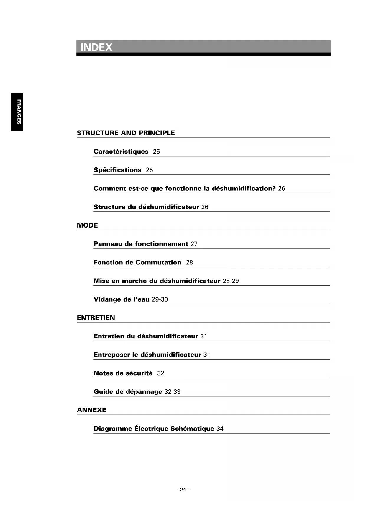 agents de service ou par une personne qualifiée afin d'éviter tout danger. When use the unit, please observe the following safety precautions: Entretien ● Notes de sécurité Si une des situations décrites ci-dessous apparaît, veuillez vérifier les points suivants pour éviter de per- dre du temps et de l’argent. Entretien ● Guide de dépannage Condition Cause Que faire ? L’unité ne fonctionne pas. Est-ce que le câble d’ali- mentation a été débranché ? Est-ce que la température de la pièce est supérieure à 38ºC ou inférieure à 2ºC ? Veuillez brancher le cordon d’alimenta- tion dans la prise. Veuillez vider l’eau du réservoir de vidange, puis le remettre en place. Le mécanisme de protection est activé et l’unité ne peut se mettre marche, car les conditions ne sont pas bonnes (dans ce cas, veuillez ne pas utiliser le déshumidificateur.) Est-ce que le voyant “ ” clignote ? (Le réservoir est plein ou mal positionné.)FRANCES Entretien La fonction de déshumidification ne fonctionne pas. Est-ce que le filtre à air est obstrué ? Est-ce que les orifices d’entrée ou de sortie d’air sont obstrués ? Veuillez nettoyer le filtre à air comme indiqué dans la rubrique “Entretien du déshumidificateur”. Veuillez retirer ce qui obstrue les orifi- ces d’entrée ou de sortie d’air. L’air n’est pas expulsé. Est-ce que le filtre à air est obstrué ? Veuillez nettoyer le filtre à air comme indiqué dans la rubrique “Entretien du déshumidificateur”. Le fonctionnement est bruyant. Est-ce que l’unité a été insta- llée de manière incorrecte ? Est-elle inclinée ou instable ? Est-ce que le filtre à air est obstrué? Veuillez place l’unité sur une surface stable et solide. Solution: Mettez un coussinet sous l’u- nité afin de réduire le bruit. Veuillez nettoyer le filtre à air comme indiqué dans la rubrique “Entretien du déshumidificateur”. ● Si après avoir effectué les étapes correspondant aux pannes décrites ci-dessus, la panne ne peut pas être réparée ou si d’autres pannes apparaissent, veuillez contacter un centre de service autorisé. Les symptômes suivants n’indiquent pas une panne Entretien ● Guide de dépannage Symptôme Cause Le bruit augmente soudainement pen- dant le fonctionnement Le niveau sonore de l’unité augmente avec la mise en route du compresseur. La déshumidification est très faible ou inexistante. Cela peut arriver lorsque la température et/ou l’humidité de la pièce sont trop basses. Lorsque l’unité est utilisée pour la pre- mière fois, l’air expulsé sent le moisi. Parce que la température de la tête d’échange thermique monte soudainement, une odeur inhabituelle ou une odeur de moisi peut apparaître pendant un moment. L’humidité ne baisse pas. Est-ce que la pièce est trop grande pour l’unité ? Est-ce que les portes et les fenêtres sont ouvertes et fermées fréquemment ? Y a-t-il un appareil dans la pièce comme un chauffage à kérosène par exemple, qui émet de la vapeur ? - 33 -Au démarrage de l’unité ou au cours d’un changement de mode de fonctionne- ment, on entend un bruit inhabituel dans l’unité centrale. FRANCES