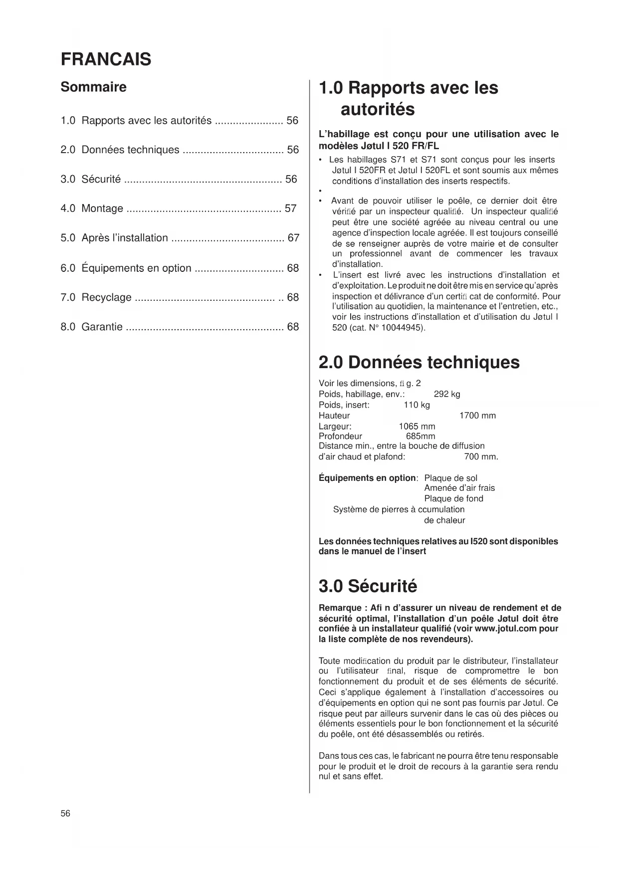 - Les habillages S71 et S71 sont concus pour les inserts Jotul I 520FR et Jotul I 520FL et sont soumis aux mêmes conditions d'installation des inserts respectifs.