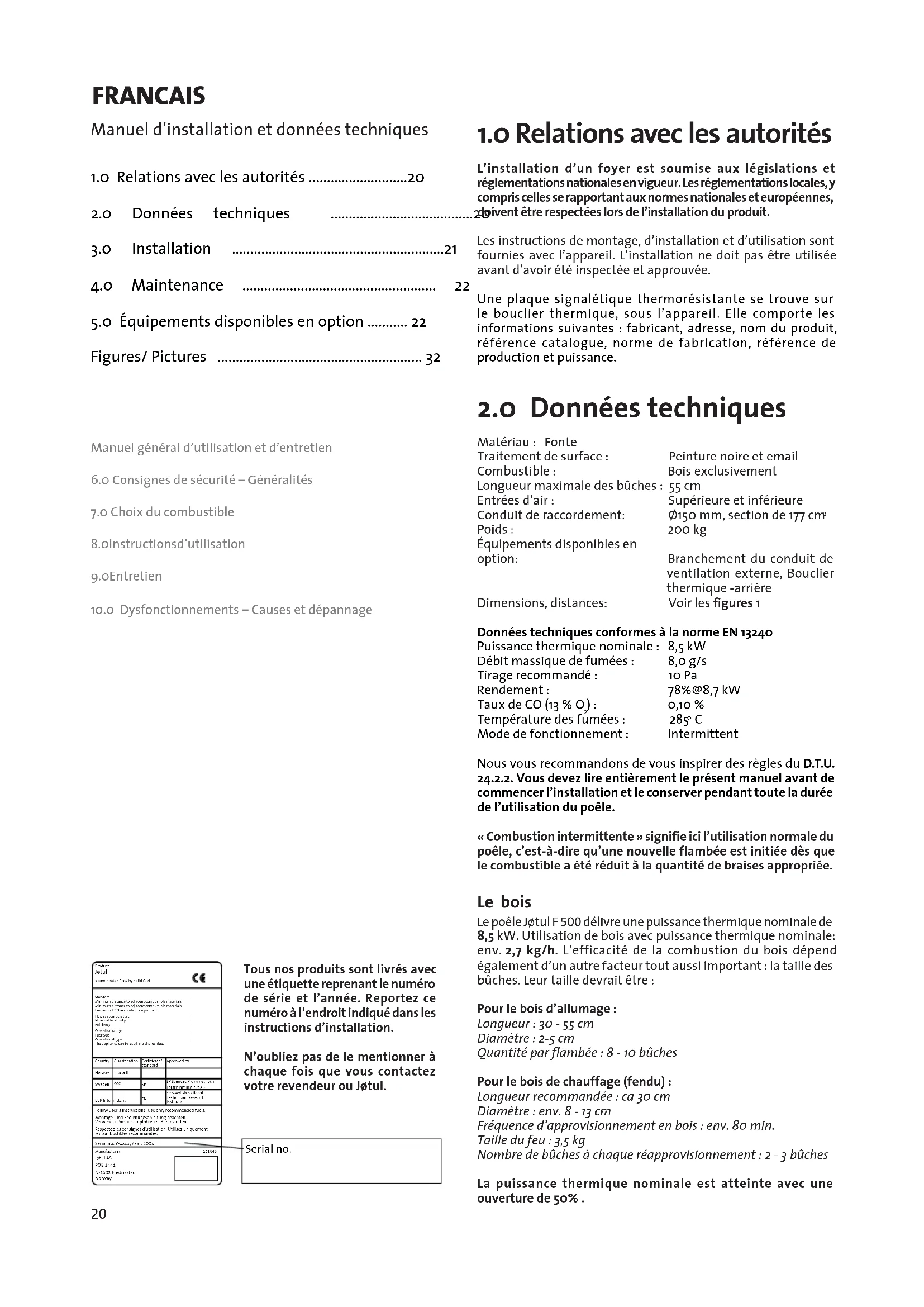 Serial no. Tous nos produits sont livrés avec une étiquette reprenant le numéro de série et l’année. Reportez ce numéro à l’endroit indiqué dans les instructions d’installation. N’oubliez pas de le mentionner à chaque fois que vous contactez votre revendeur ou Jøtul.