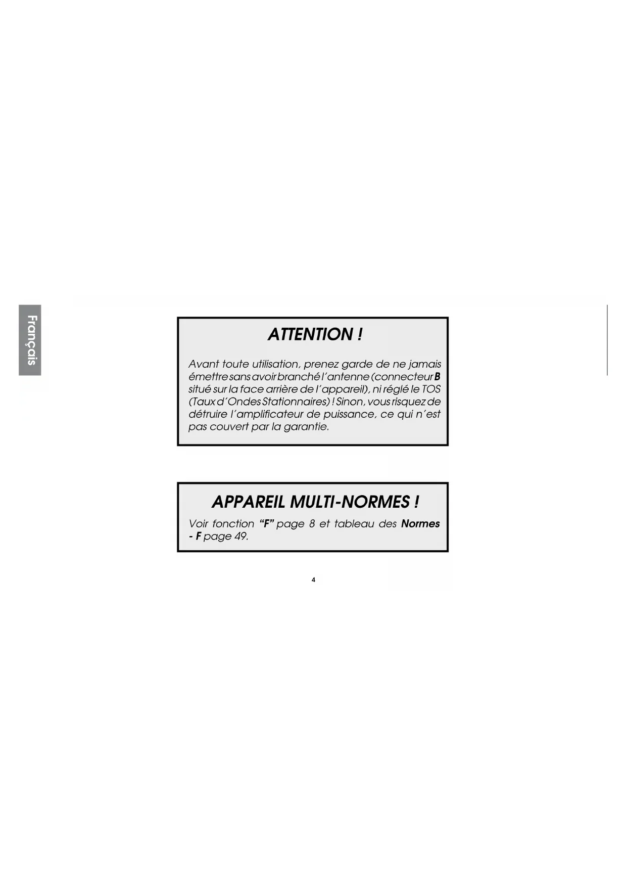 Français Polski Español English 3Français APPAREIL MULTI-NORMES ! Voir fonction “F” page 8 et tableau des Normes - F page 49. ATTENTION ! Avant toute utilisation, prenez garde de ne jamais émettre sans avoir branché l’antenne (connecteur B situé sur la face arrière de l’appareil), ni réglé le TOS (Taux d’Ondes Stationnaires) ! Sinon, vous risquez de détruire l’amplificateur de puissance, ce qui n’est pas couvert par la garantie. Français