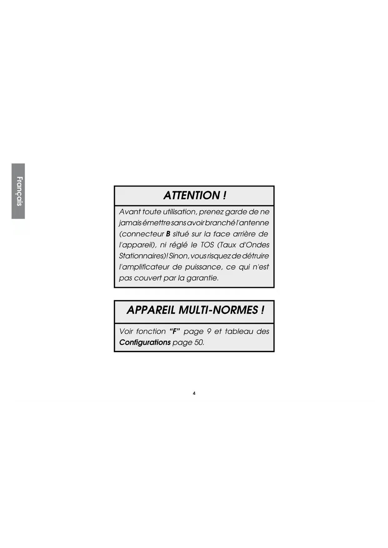 NORMY EUROPEJSKIE ......................................................................... 504 Français ATTENTION ! APPAREIL MULTI-NORMES ! Avant toute utilisation, prenez garde de ne jamais émettre sans avoir branché l'antenne (connecteur B situé sur la face arrière de l'appareil), ni réglé le TOS (Taux d'Ondes Stationnaires)! Sinon, vous risquez de détruire l'amplificateur de puissance, ce qui n'est pas couvert par la garantie. Voir fonction “F” page 9 et tableau des Configurations page 50.5 Bienvenue dans le monde des émetteurs-récepteurs CB de la dernière génération. Cette nouvelle gamme de postes vous fait accéder à la communication élec- tronique la plus performante. Grâce à l’utilisation de technologies de pointe garantissant des qualités sans précédent, votre PRESIDENT JACKSON II ASC Classic est un nouveau jalon dans la convivialité et la solution par excellence pour le pro de la CB le plus exigeant. Pour tirer le meilleur parti de toutes ses possibilités, nous vous conseillons de lire attentivement ce mode d’emploi avant d’installer et d’utiliser votre CB PRESIDENT JACK- SON II ASC Classic. A) INSTALLATION