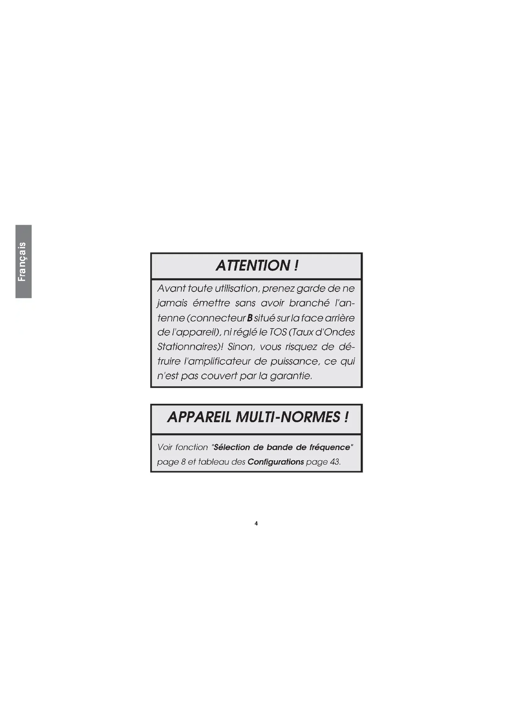 Français ATTENTION ! APPAREIL MULTI-NORMES ! Avant toute utilisation, prenez garde de ne jamais émettre sans avoir branché l'an- tenne (connecteur B situé sur la face arrière de l'appareil), ni réglé le TOS (Taux d'Ondes Stationnaires)! Sinon, vous risquez de dé- truire l'amplificateur de puissance, ce qui n'est pas couvert par la garantie. Voir fonction "Sélection de bande de fréquence" page 8 et tableau des Configurations page 43.5 Français Bienvenue dans le monde des émetteurs-récepteurs CB de la dernière génération. Cette nouvelle gamme de postes vous fait accéder à la communication électroni- que la plus performante. Grâce à l’utilisation de techno- logies de pointe garantissant des qualités sans précé- dent, votre EMPEROR KENJI est un nouveau jalon dans la convivialité et la solution par excellence pour le pro de la CB le plus exigeant. Pour tirer le meilleur parti de toutes ses possibilités, nous vous conseillons de lire attentive- ment ce mode d’emploi avant d’installer et d’utiliser votre CB EMPEROR KENJI. A) INSTALLATION :