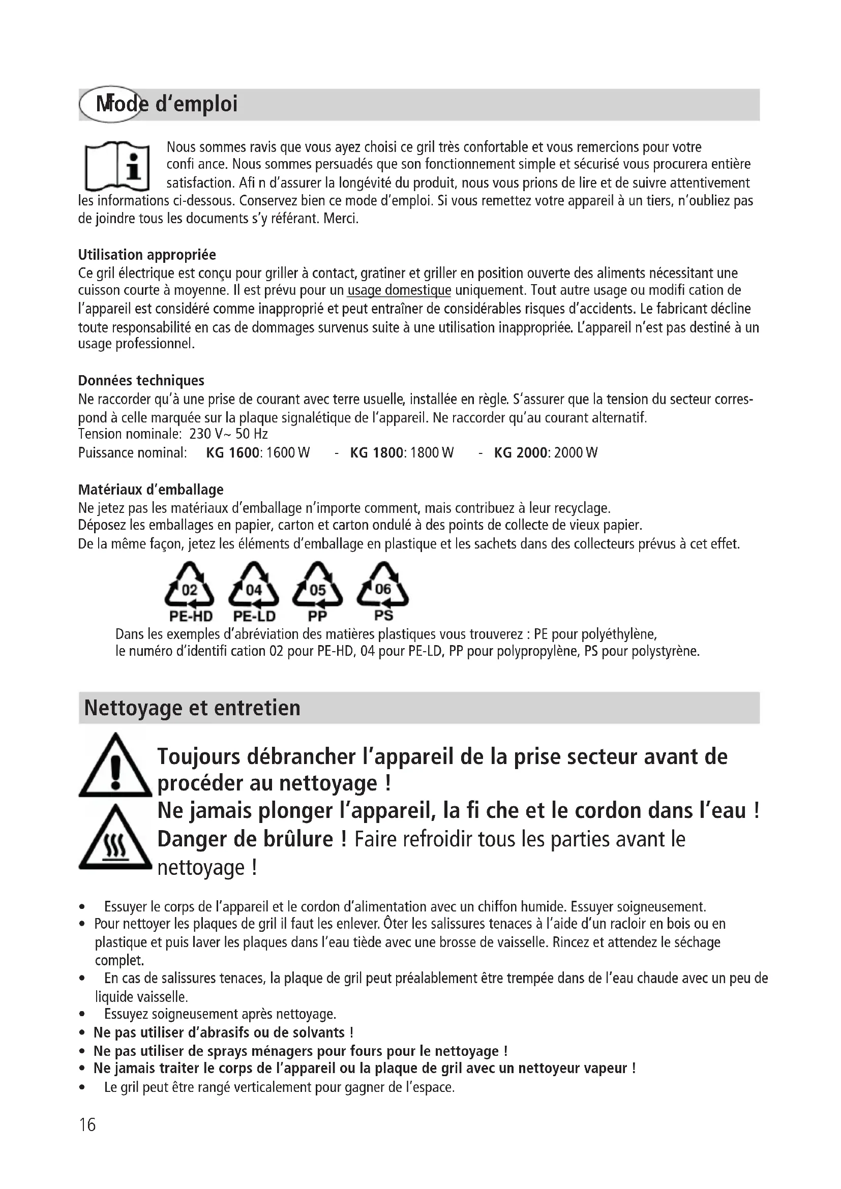 Mode d‘emploi Noussommesravisquevousayezchoisicegriltrèsconfortableetvousremercionspourvotre conance.Noussommespersuadésquesonfonctionnementsimpleetsécurisévousprocureraentière satisfaction.And’assurerlalongévitéduproduit,nousvousprionsdelireetdesuivreattentivement les informations ci-dessous. Conservez bien ce mode d’emploi. Si vous remettez votre appareil à un tiers, n’oubliez pas dejoindretouslesdocumentss’yréférant.Merci. Utilisation appropriée Cegrilélectriqueestconçupourgrilleràcontact,gratineretgrillerenpositionouvertedesalimentsnécessitantune cuissoncourteàmoyenne.Ilestprévupourunusagedomestiqueuniquement.Toutautreusageoumodicationde l’appareilestconsidérécommeinappropriéetpeutentraînerdeconsidérablesrisquesd’accidents.Lefabricantdécline touteresponsabilitéencasdedommagessurvenussuiteàuneutilisationinappropriée.L’appareiln’estpasdestinéàun usage professionnel. Données techniques Neraccorderqu’àuneprisedecourantavecterreusuelle,installéeenrègle.S‘assurerquelatensiondusecteurcorres- pondàcellemarquéesurlaplaquesignalétiquedel‘appareil.Neraccorderqu’aucourantalternatif. Tension nominale: 230 V~ 50 Hz Puissance nominal: KG 1600: 1600 W - KG 1800: 1800 W - KG 2000: 2000 W Matériaux d’emballage Nejetezpaslesmatériauxd’emballagen’importecomment,maiscontribuezàleurrecyclage. Déposezlesemballagesenpapier,cartonetcartononduléàdespointsdecollectedevieuxpapier. Delamêmefaçon,jetezlesélémentsd’emballageenplastiqueetlessachetsdansdescollecteursprévusàceteffet. Danslesexemplesd’abréviationdesmatièresplastiquesvoustrouverez:PEpourpolyéthylène, lenumérod’identication02pourPE-HD,04pourPE-LD,PPpourpolypropylène,PSpourpolystyrène.