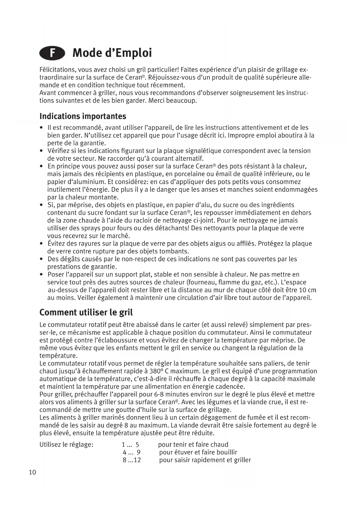 F Mode d’Emploi Félicitations, vous avez choisi un gril particulier! Faites expérience d’un plaisir de grillage ex- traordinaire sur la surface de Ceran