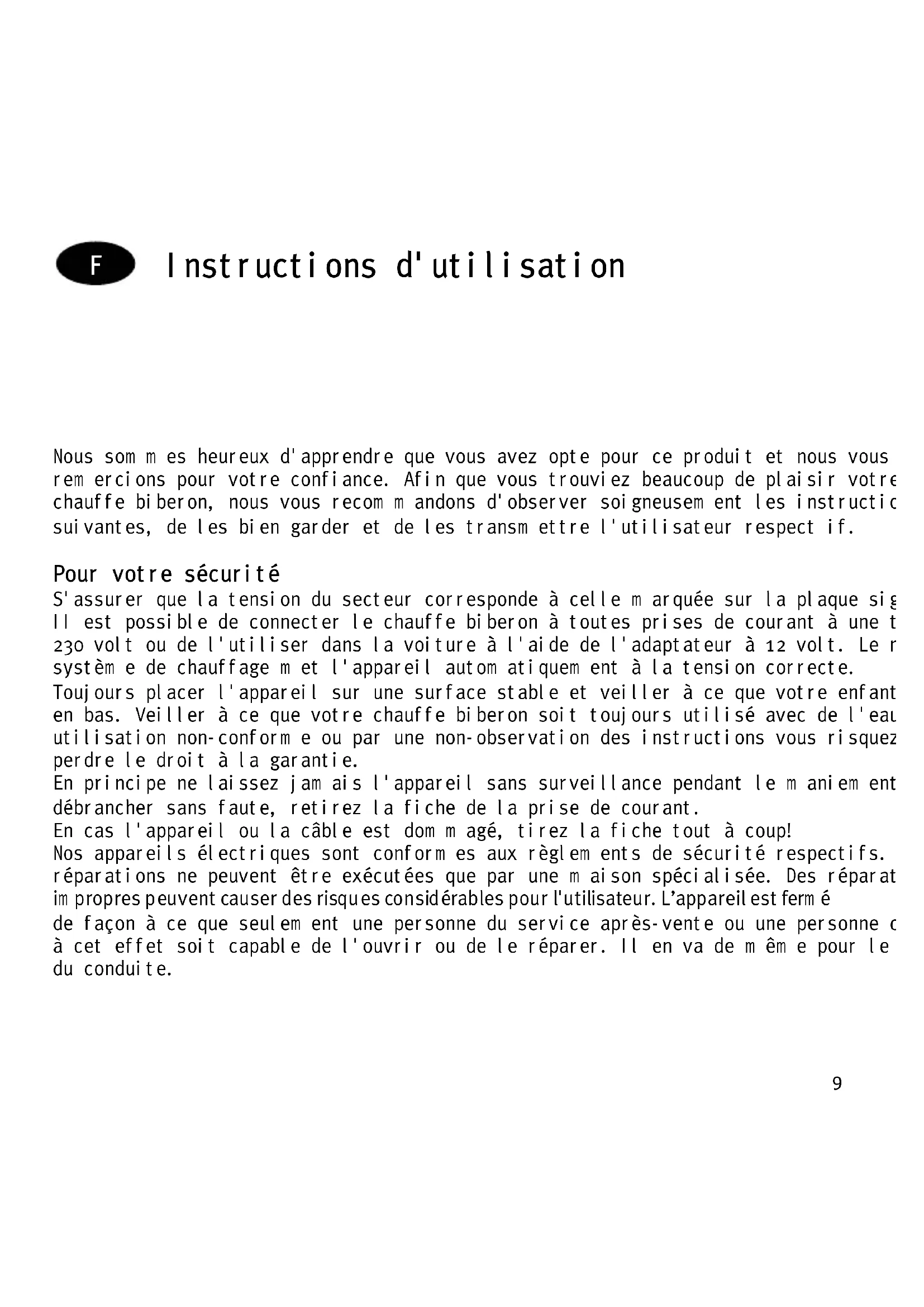 Nous som m es heureux d'apprendre que vous avez opte pour ce produit et nous vous rem ercions pour votre confiance. Afin que vous trouviez beaucoup de plaisir votre nouveau chauffe biberon, nous vous recom m andons d'observer soigneusem ent les instructions suivantes, de les bien garder et de les transm ettre l'utilisateur respect if. Pour votre sécurité S'assurer que la tension du secteur corresponde à celle m arquée sur la plaque signalétique. II est possible de connecter le chauffe biberon à toutes prises de courant à une tension de 230 volt ou de l'utiliser dans la voiture à l'aide de l'adaptateur à 12 volt. Le nouveau systèm e de chauffage m et l'appareil autom atiquem ent à la tension correcte. Toujours placer l'appareil sur une surface stable et veiller à ce que votre enfant ne le tire pas en bas. Veiller à ce que votre chauffe biberon soit toujours utilisé avec de l'eau. Par une utilisation non-conform e ou par une non-observation des instructions vous risquez de perdre le droit à la garantie. En principe ne laissez jam ais l'appareil sans surveillance pendant le m aniem ent. Pour débrancher sans faute, retirez la fiche de la prise de courant. En cas l'appareil ou la câble est dom m agé, tirez la fiche tout à coup! Nos appareils électriques sont conform es aux règlem ents de sécurité respectifs. Des réparations ne peuvent être exécutées que par une m aison spécialisée. Des réparations im propres peuvent causer des risques considérables pour l'utilisateur. L’appareil est ferm é de façon à ce que seulem ent une personne du service après-vente ou une personne chargée à cet effet soit capable de l'ouvrir ou de le réparer. Il en va de m êm e pour le rem placem ent du conduite. F10 Réchauffer les biberons Placer le biberon dans le chauffe biberon et rem plir l'espace vide entre le biberon et le récipient intérieur avec de l'eau. Brancher alors l'appareil au réseau et régler la tem pérature dem andée à l'aide du bouton tournant. La lam pe tém oin s'allum e, le chauffage com m ence. Au bout de 8 m inutes environ, la tem pérature de nourriture agréable au goût de votre bébé est atteinte et la lam pe tém oin s'éteint. Retirer m aintenant le biberon ou rem ettre le bouton tournant (voir ‘M aintenir la tem perature’). Avant de donner à boire à votre bébé, vérifier si le contenu a la bonne tem pérature de consom m ation. Pour ce faire, légèrem ent agiter le biberon afin que la chaleur se répartisse régulièrem ent. Couper l'appareil après usage en tournant le bouton tournant en sens inverse horaire jusqu'a la butée et retirer la fiche de contact. Attention: Réchauffer la nourriture de bébés ne depend pas seulem ent du réglage de tem pérature, m ais aussi de la tem pérature initiale de la nourriture et de l'eau, de l'épaisseur du verre, de la quantité de la nourriture et de sa consistence. Le sym bole ,Biberon' sert de point de repère pour un réchauffem ent rapide. En peu de tem ps déjà, vous saurez com m ent régler l'appareil pour avoir la tem pérature idéale pour la nourriture. Réchauffer les verres de nourriture de bébés Retirer l'étiquette du verre afin qu'elle ne se détache et colle au récipient intérieur. Retirer le couvercle et serrer la rail de retenue autour du filet. Placer alors le verre dans le récipient l'intérieur et rem plir l'espace vide entre le biberon et le récipient intérieur avec de l'eau. M ettre le bouton tournant au sym bole ,Verre’ la lam pe tém oin s’allum e et le chauffage com m ence. Afin que la chaleur se répartisse plus régulièrem ent, rem uer plusieurs fois le contenu du verre. Au bout du tem ps de chauffage, la lam pe tém oin s'éteint et la tem pérature dem andée de la nourriture est atteinte.11 M aintenir La tem pérature Cet appareil vous perm et égalem ent de m aintenir la tem pérature de la nourriture de bébés pour peu de tem ps. Pour ce faire, m ettre le bouton tournant dans la plage "M aintenir au chaud" (voir illustration à la page 2). Pour des raisons de m icrobiologie et d'hygiène, ne jam ais m aintenir la tem pérature de la nourriture de bébés de plus d'une heure au m axim um .