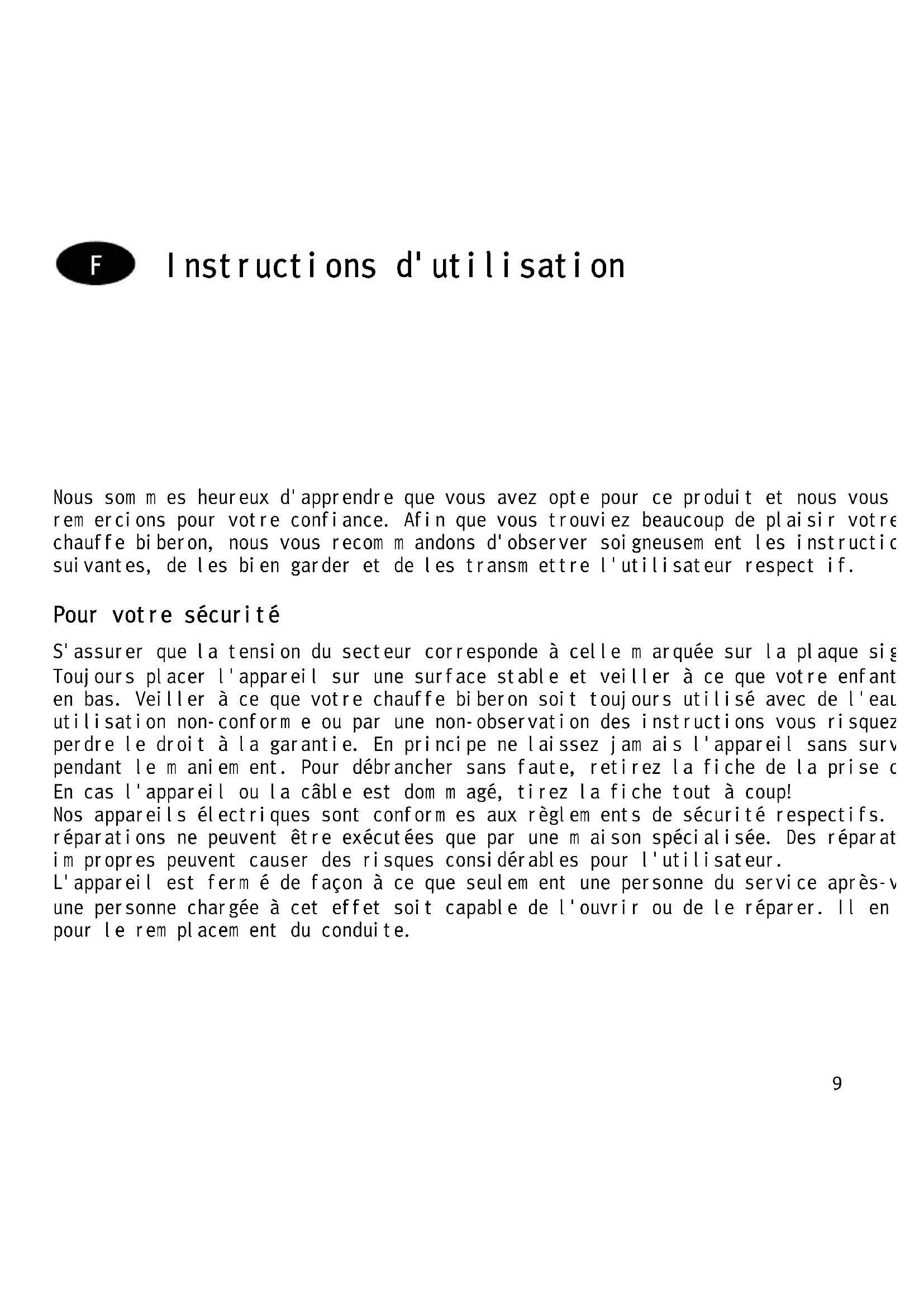 Nous som m es heureux d'apprendre que vous avez opte pour ce produit et nous vous rem ercions pour votre confiance. Afin que vous trouviez beaucoup de plaisir votre nouveau chauffe biberon, nous vous recom m andons d'observer soigneusem ent les instructions suivantes, de les bien garder et de les transm ettre l'utilisateur respect if. Pour votre sécurité S'assurer que la tension du secteur corresponde à celle m arquée sur la plaque signalétique. Toujours placer l'appareil sur une surface stable et veiller à ce que votre enfant ne le tire pas en bas. Veiller à ce que votre chauffe biberon soit toujours utilisé avec de l'eau. Par une utilisation non-conform e ou par une non-observation des instructions vous risquez de perdre le droit à la garantie. En principe ne laissez jam ais l'appareil sans surveillance pendant le m aniem ent. Pour débrancher sans faute, retirez la fiche de la prise de courant. En cas l'appareil ou la câble est dom m agé, tirez la fiche tout à coup! Nos appareils électriques sont conform es aux règlem ents de sécurité respectifs. Des réparations ne peuvent être exécutées que par une m aison spécialisée. Des réparations im propres peuvent causer des risques considérables pour l'utilisateur. L'appareil est ferm é de façon à ce que seulem ent une personne du service après-vente ou une personne chargée à cet effet soit capable de l'ouvrir ou de le réparer. Il en va de m êm e pour le rem placem ent du conduite. F10 Réchauffer les biberons Placer le biberon dans le chauffe biberon et rem plir l'espace vide entre le biberon et le récipient intérieur avec de l'eau. Brancher alors l'appareil au réseau et régler la tem pérature dem andée à l'aide du bouton tournant. La lam pe tém oin s'allum e, le chauffage com m ence. Au bout de 8 m inutes environ, la tem pérature de nourriture agréable au goût de votre bébé est atteinte et la lam pe tém oin s'éteint. Retirer m aintenant le biberon ou rem ettre le bouton tournant (voir ‘M aintenir la tem perature’). Avant de donner à boire à votre bébé, vérifier si le contenu a la bonne tem pérature de consom m ation. Pour ce faire, légèrem ent agiter le biberon afin que la chaleur se répartisse régulièrem ent. Couper l'appareil après usage en tournant le bouton tournant en sens inverse horaire jusqu'a la butée et retirer la fiche de contact. Attention: Réchauffer la nourriture de bébés ne depend pas seulem ent du réglage de tem pérature, m ais aussi de la tem pérature initiale de la nourriture et de l'eau, de l'épaisseur du verre, de la quantité de la nourriture et de sa consistence. Le sym bole ,Biberon' sert de point de repère pour un réchauffem ent rapide. En peu de tem ps déjà, vous saurez com m ent régler l'appareil pour avoir la tem pérature idéale pour la nourriture. Réchauffer les verres de nourriture de bébés Retirer l'étiquette du verre afin qu'elle ne se détache et colle au récipient intérieur. Retirer le couvercle et serrer la rail de retenue autour du filet. Placer alors le verre dans le récipient l'intérieur et rem plir l'espace vide entre le biberon et le récipient intérieur avec de l'eau. M ettre le bouton tournant au sym bole ,Verre’ la lam pe tém oin s’allum e et le chauffage com m ence. Afin que la chaleur se répartisse plus régulièrem ent, rem uer plusieurs fois le contenu du verre. Au bout du tem ps de chauffage, la lam pe tém oin s'éteint et la tem pérature dem andée de la nourriture est atteinte.11 M aintenir La tem pérature Cet appareil vous perm et égalem ent de m aintenir la tem pérature de la nourriture de bébés pour peu de tem ps. Pour ce faire, m ettre le bouton tournant dans la plage "M aintenir au chaud" (voir illustration à la page 2). Pour des raisons de m icrobiologie et d'hygiène, ne jam ais m aintenir la tem pérature de la nourriture de bébés de plus d'une heure au m axim um . N ettoyage et entretien Avant le nettoyage, retirez la fiche de la prise de courant et laissez refroidir l'appareil. Essuyer le chauffe biberon à un chiffon hum ide après chaque usage afin d'éviter des dépôts calcaires. Ne pas utiliser des détergents et des poudres à récurer Ne jam ais im m erger l'appareil dans l'eau et ne pas effectuer le nettoyage à un appareil à jet de vapeur.12 Istruzioni per l'uso