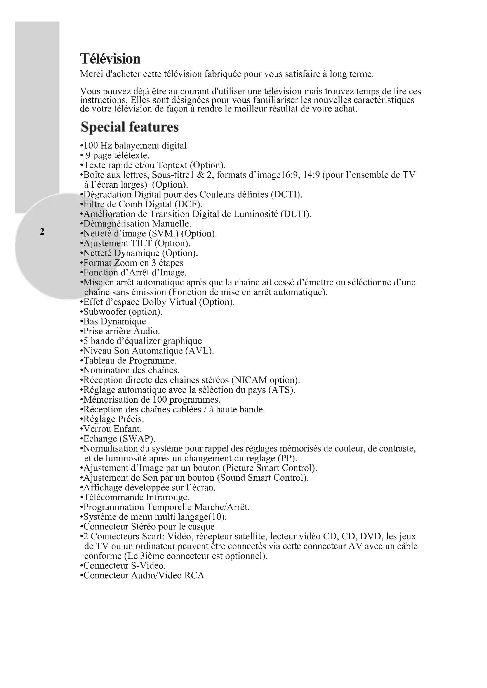 - Réception directe des chaînes stéréos (NICAM option).