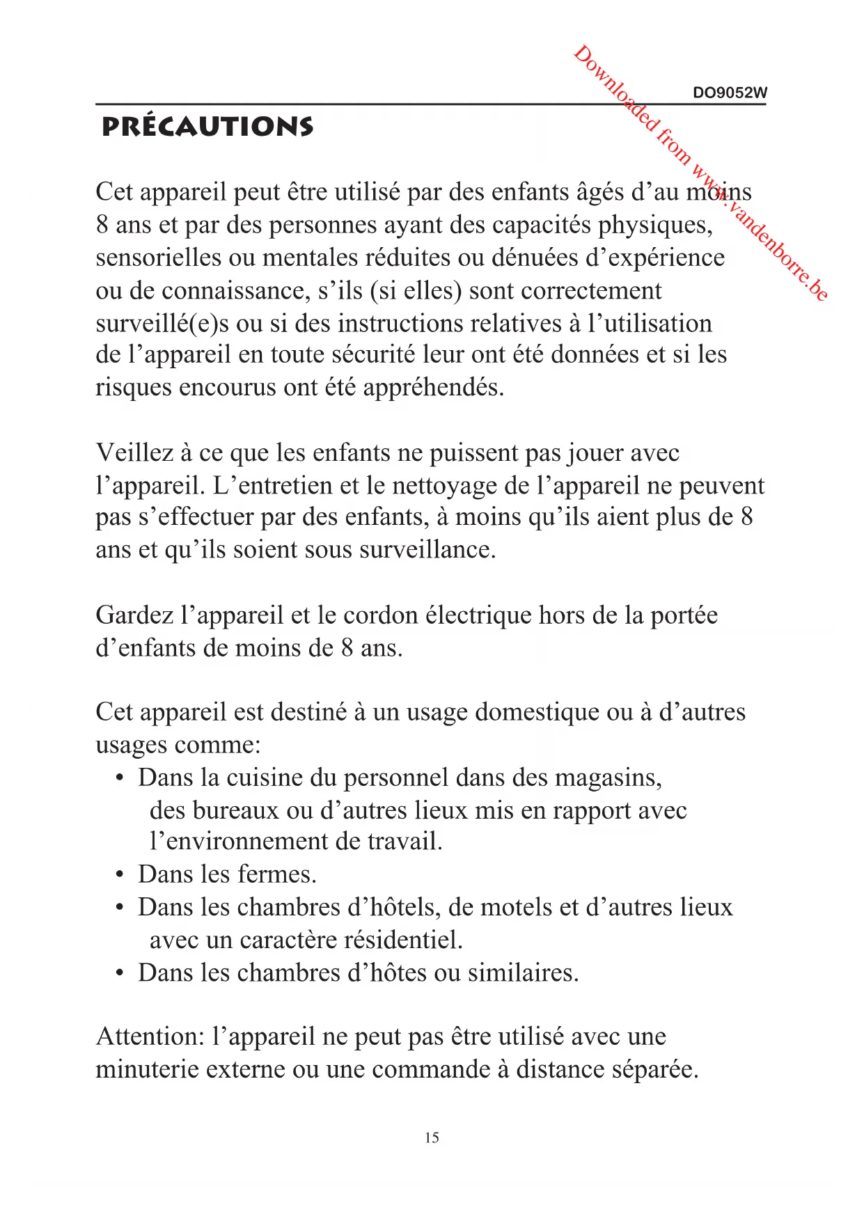 - Dans les chambres d’hôtes ou similaires. Attention: l’appareil ne peut pas être utilisé avec une minuterie externe ou une commande à distance séparée. Downloaded from www.vandenborre.beDO9052W