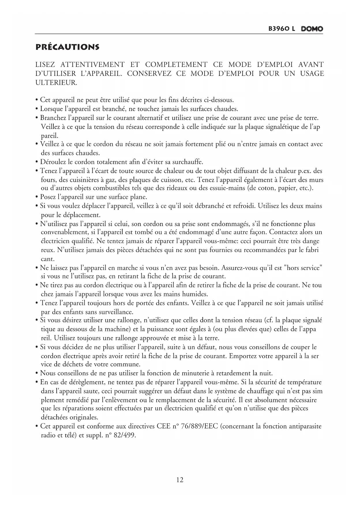 - En cas de déroglement, ne tentez pas de réparer l'appareil vous-même. Si la sécurité de température dans l'appareil saute, ceci pourrait suggérer un défaut dans le système de chauffage qui n'est pas simplement remédied par l'enlèvement ou le remplacement de la sécurité. Il est absolument nécessaire que les réparations soient effectuées par un électricien qualifié et qu'on n'utilise que des pièces détachées originales.