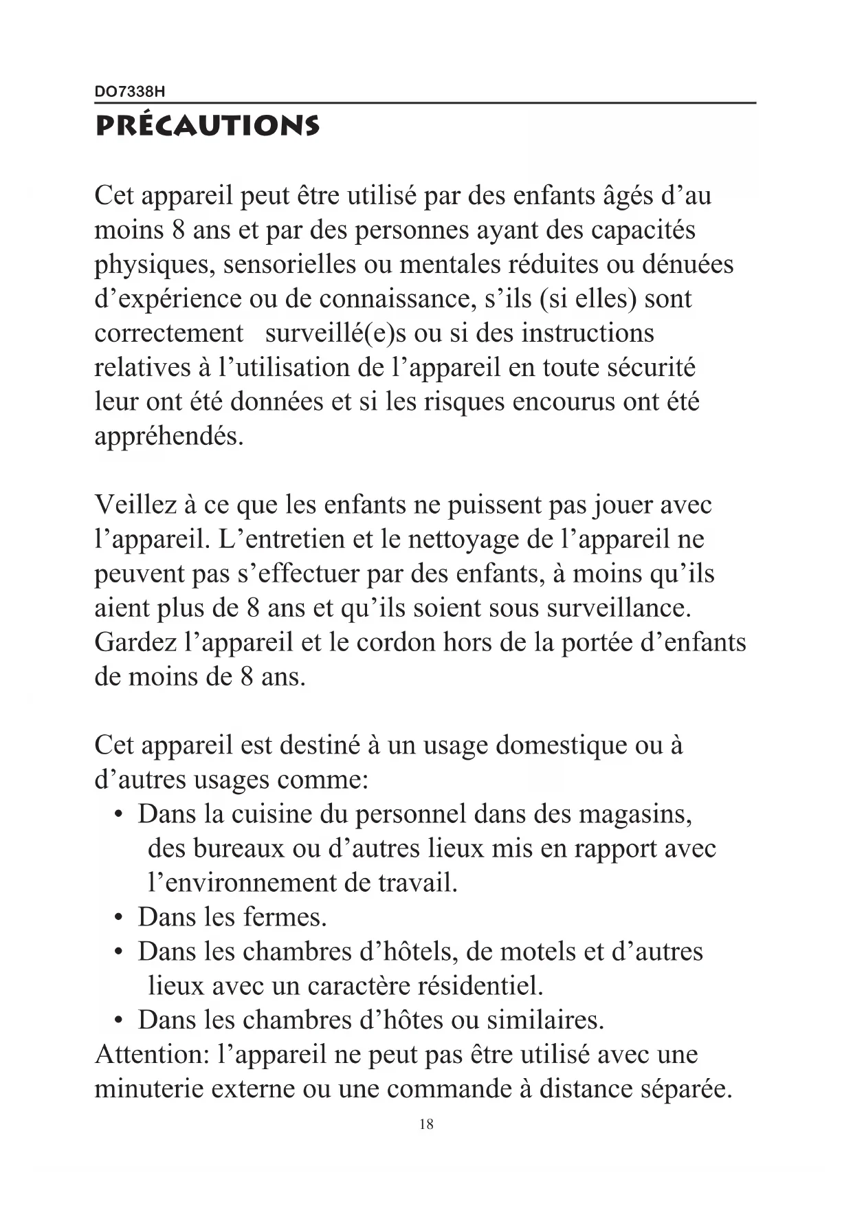 - Dans les chambres d’hôtes ou similaires. Attention: l’appareil ne peut pas être utilisé avec une minuterie externe ou une commande à distance séparée.DO7338H