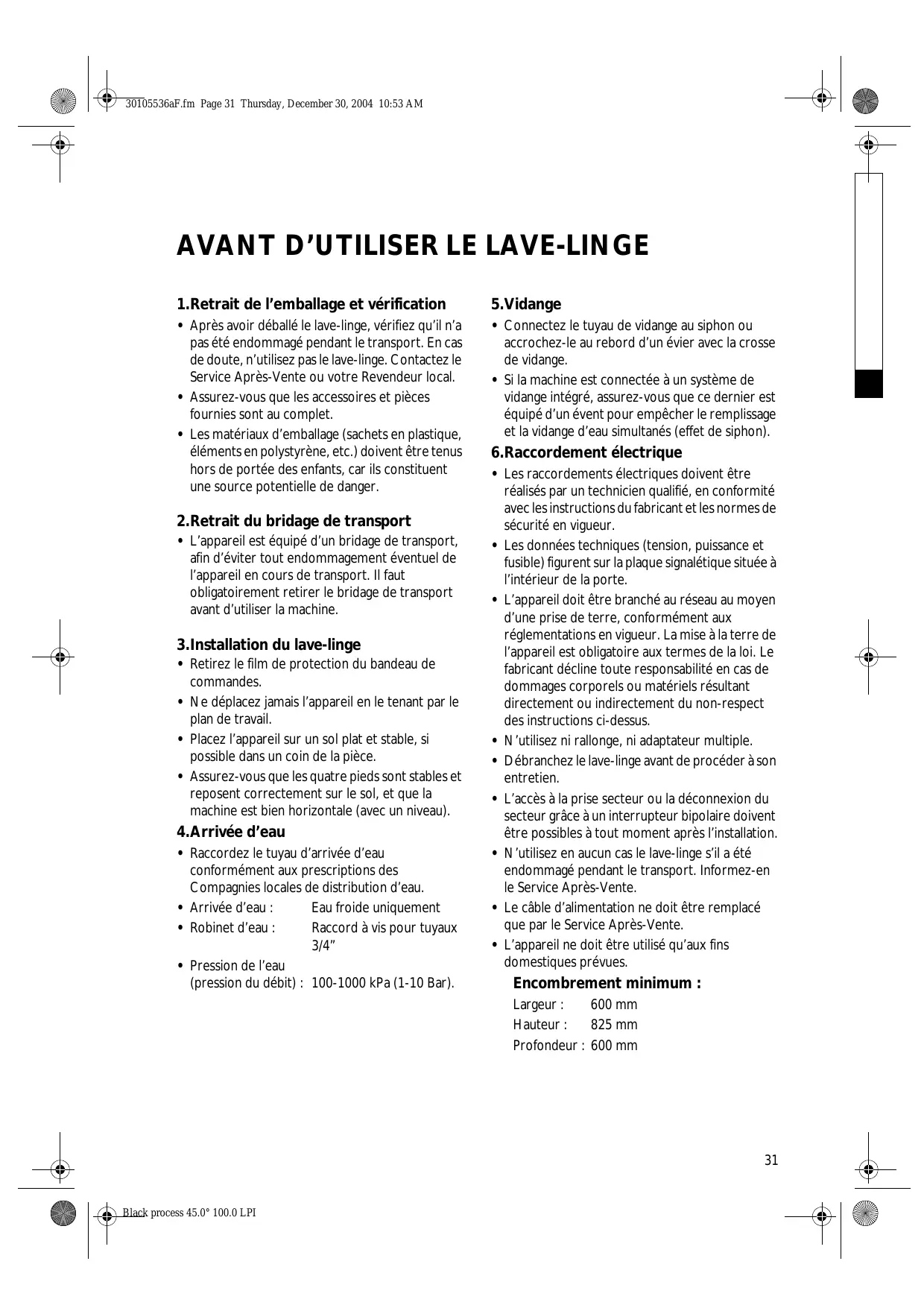 - L’appareil ne doit être utilisé qu’aux fins domestiques prévues. Encombrement minimum : Largeur : 600 mm Hauteur : 825 mm Profondeur : 600 mm