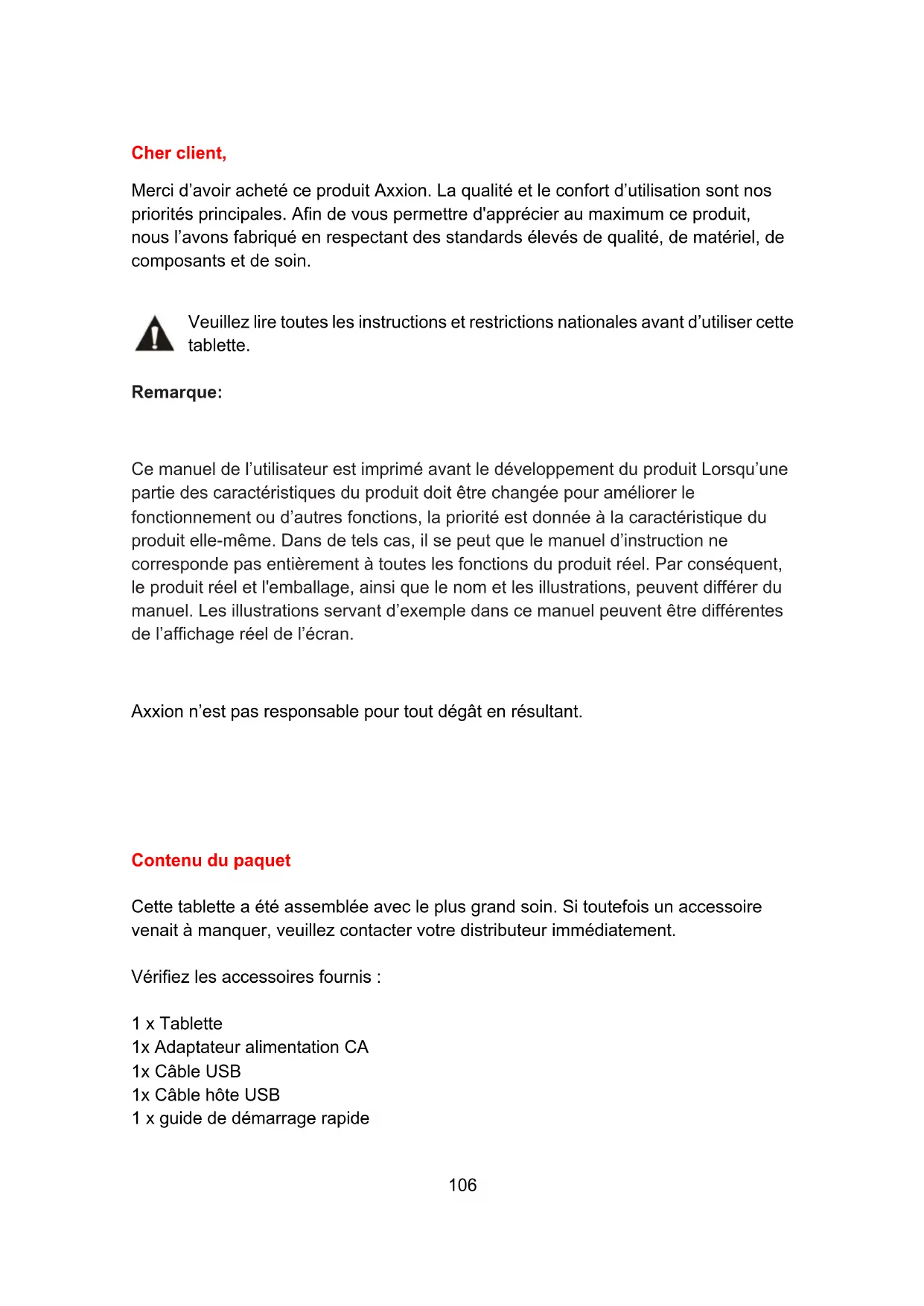 Lorsque you utilisez la tablette, assurez-vous de sauvegarder toutes vos données importantes. Axxion n'est pas responsable pour la perte de vos données.