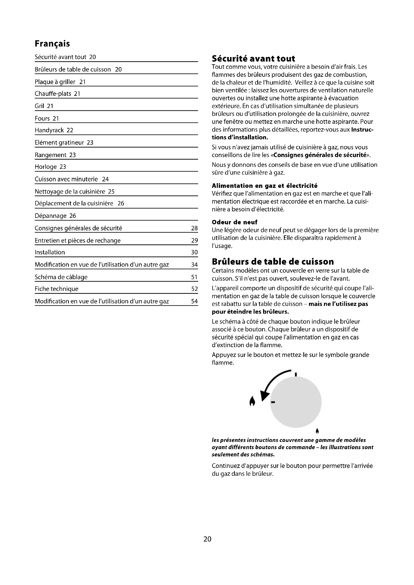 Sécurité avant tout Tout comme vous, votre cuisinière a besoin d’air frais. Les ammes des brûleurs produisent des gaz de combustion, de la chaleur et de l’humidité. Veillez à ce que la cuisine soit bien ventilée : laissez les ouvertures de ventilation naturelle ouvertes ou installez une hotte aspirante à évacuation extérieure. En cas d’utilisation simultanée de plusieurs brûleurs ou d’utilisation prolongée de la cuisinière, ouvrez une fenêtre ou mettez en marche une hotte aspirante. Pour des informations plus détaillées, reportez-vous aux Instruc- tions d’installation. Si vous n’avez jamais utilisé de cuisinière à gaz, nous vous conseillons de lire les «Consignes générales de sécurité». Nous y donnons des conseils de base en vue d’une utilisation sûre d’une cuisinière à gaz. Alimentation en gaz et électricité Vériez que l’alimentation en gaz est en marche et que l’ali- mentation électrique est raccordée et en marche. La cuisi- nière a besoin d’électricité. Odeur de neuf Une légère odeur de neuf peut se dégager lors de la première utilisation de la cuisinière. Elle disparaîtra rapidement à l’usage. Brûleurs de table de cuisson Certains modèles ont un couvercle en verre sur la table de cuisson. S’il n’est pas ouvert, soulevez-le de l’avant. L’appareil comporte un dispositif de sécurité qui coupe l’ali- mentation en gaz de la table de cuisson lorsque le couvercle est rabattu sur la table de cuisson – mais ne l’utilisez pas pour éteindre les brûleurs. Le schéma à côté de chaque bouton indique le brûleur associé à ce bouton. Chaque brûleur a un dispositif de sécurité spécial qui coupe l’alimentation en gaz en cas d’extinction de la amme. Appuyez sur le bouton et mettez-le sur le symbole grande amme. les présentes instructions couvrent une gamme de modèles ayant différents boutons de commande – les illustrations sont seulement des schémas. Continuez d’appuyer sur le bouton pour permettre l’arrivée du gaz dans le brûleur. Sécurité avant tout 20 Brûleurs de table de cuisson 20 Plaque à griller 21 Chaue-plats 21 Gril 21 Fours 21 Handyrack 22 Elément gratineur 23 Rangement 23 Horloge 23 Cuisson avec minuterie 24 Nettoyage de la cuisinière 25 Déplacement de la cuisinière 26 Dépannage 26 Consignes générales de sécurité 28 Entretien et pièces de rechange 29 Installation 30 Modication en vue de l’utilisation d’un autre gaz 34 Schéma de câblage 51 Fiche technique 52 Modication en vue de l’utilisation d’un autre gaz 54Français