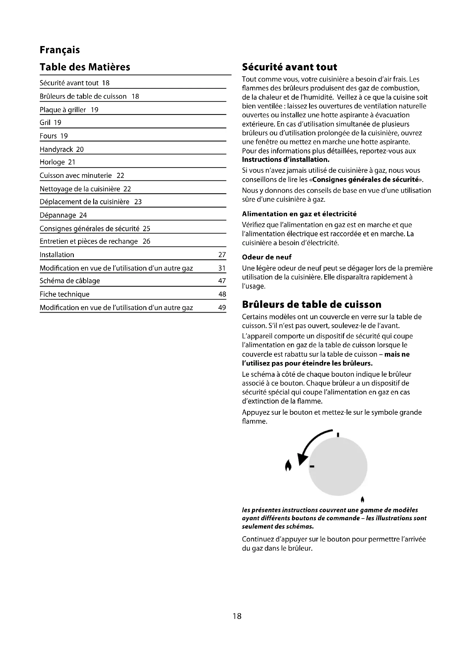 Sécurité avant tout Tout comme vous, votre cuisinière a besoin d’air frais. Les ammes des brûleurs produisent des gaz de combustion, de la chaleur et de l’humidité. Veillez à ce que la cuisine soit bien ventilée : laissez les ouvertures de ventilation naturelle ouvertes ou installez une hotte aspirante à évacuation extérieure. En cas d’utilisation simultanée de plusieurs brûleurs ou d’utilisation prolongée de la cuisinière, ouvrez une fenêtre ou mettez en marche une hotte aspirante. Pour des informations plus détaillées, reportez-vous aux Instructions d’installation. Si vous n’avez jamais utilisé de cuisinière à gaz, nous vous conseillons de lire les «Consignes générales de sécurité». Nous y donnons des conseils de base en vue d’une utilisation sûre d’une cuisinière à gaz. Alimentation en gaz et électricité Vériez que l’alimentation en gaz est en marche et que l’alimentation électrique est raccordée et en marche. La cuisinière a besoin d’électricité. Odeur de neuf Une légère odeur de neuf peut se dégager lors de la première utilisation de la cuisinière. Elle disparaîtra rapidement à l’usage. Brûleurs de table de cuisson Certains modèles ont un couvercle en verre sur la table de cuisson. S’il n’est pas ouvert, soulevez-le de l’avant. L’appareil comporte un dispositif de sécurité qui coupe l’alimentation en gaz de la table de cuisson lorsque le couvercle est rabattu sur la table de cuisson – mais ne l’utilisez pas pour éteindre les brûleurs. Le schéma à côté de chaque bouton indique le brûleur associé à ce bouton. Chaque brûleur a un dispositif de sécurité spécial qui coupe l’alimentation en gaz en cas d’extinction de la amme. Appuyez sur le bouton et mettez-le sur le symbole grande amme. les présentes instructions couvrent une gamme de modèles ayant différents boutons de commande – les illustrations sont seulement des schémas. Continuez d’appuyer sur le bouton pour permettre l’arrivée du gaz dans le brûleur. Table des Matières Sécurité avant tout 18 Brûleurs de table de cuisson 18 Plaque à griller 19 Gril 19 Fours 19 Handyrack 20 Horloge 21 Cuisson avec minuterie 22 Nettoyage de la cuisinière 22 Déplacement de la cuisinière 23 Dépannage 24 Consignes générales de sécurité 25 Entretien et pièces de rechange 26 Installation 27 Modication en vue de l’utilisation d’un autre gaz 31 Schéma de câblage 47 Fiche technique 48 Modication en vue de l’utilisation d’un autre gaz 49Français