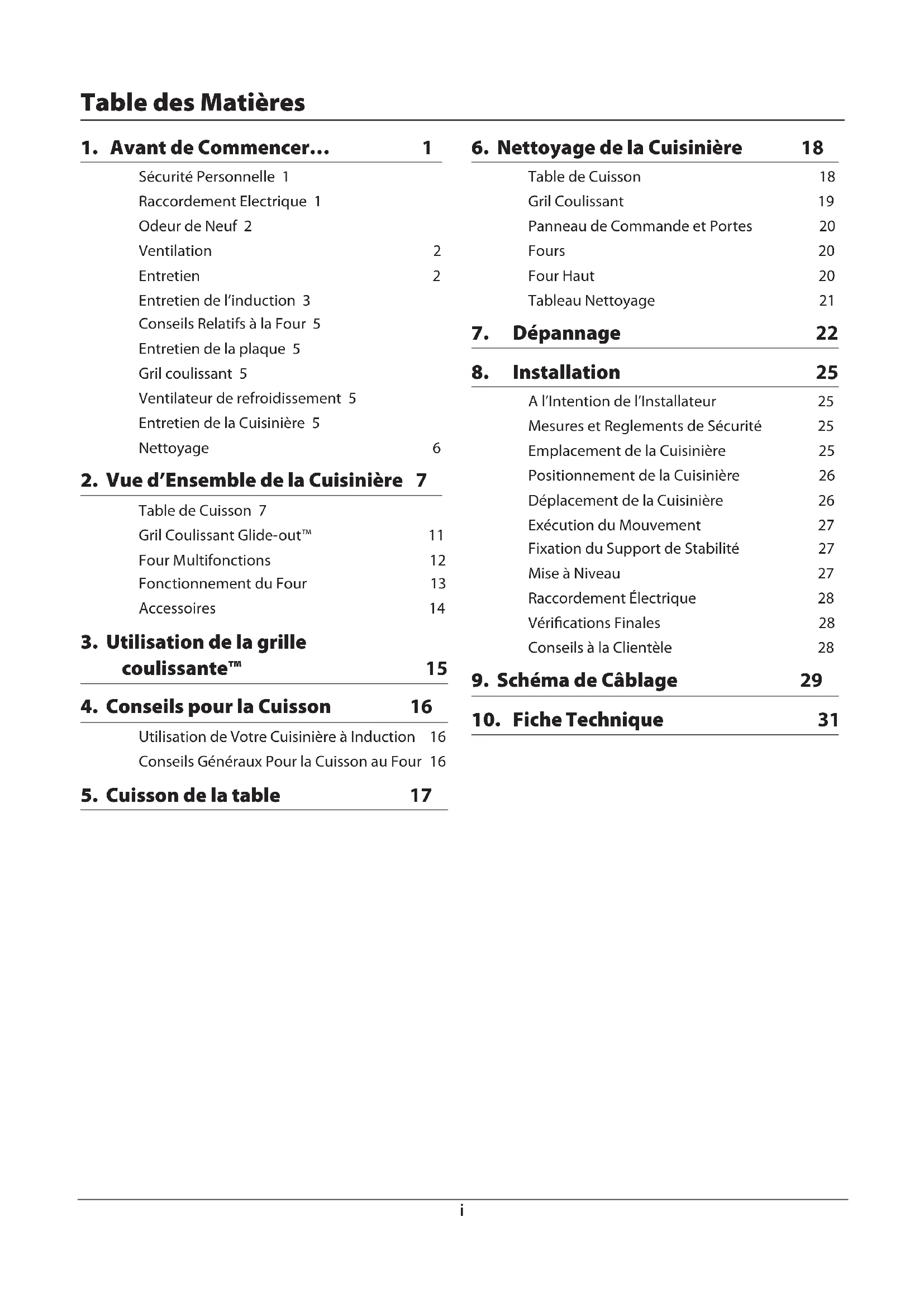 Sécurité Personnelle 1 Raccordement Electrique 1 Odeur de Neuf 2 Ventilation 2 Entretien 2 Entretien de l’induction 3 Conseils Relatifs à la Four 5 Entretien de la plaque 5 Gril coulissant 5 Ventilateur de refroidissement 5 Entretien de la Cuisinière 5 Nettoyage 6