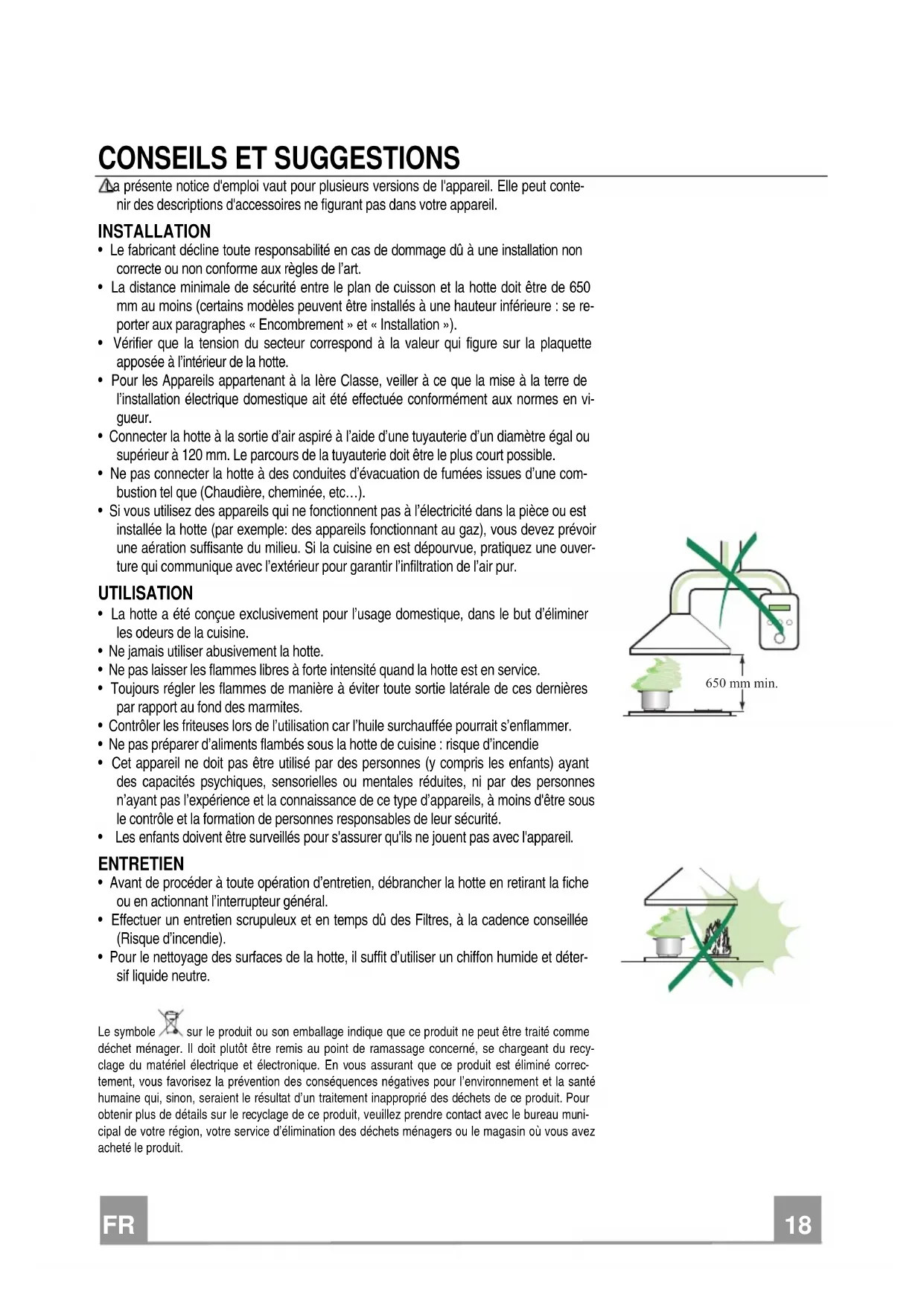- La distance minimale de sécurité entre le plan de cuisson et la hotte doit être de 650 mm au moins (certains modèles peuvent être installés à une hauteur inférieure : se reporter aux paragraphes « Encombrement » et « Installation »).