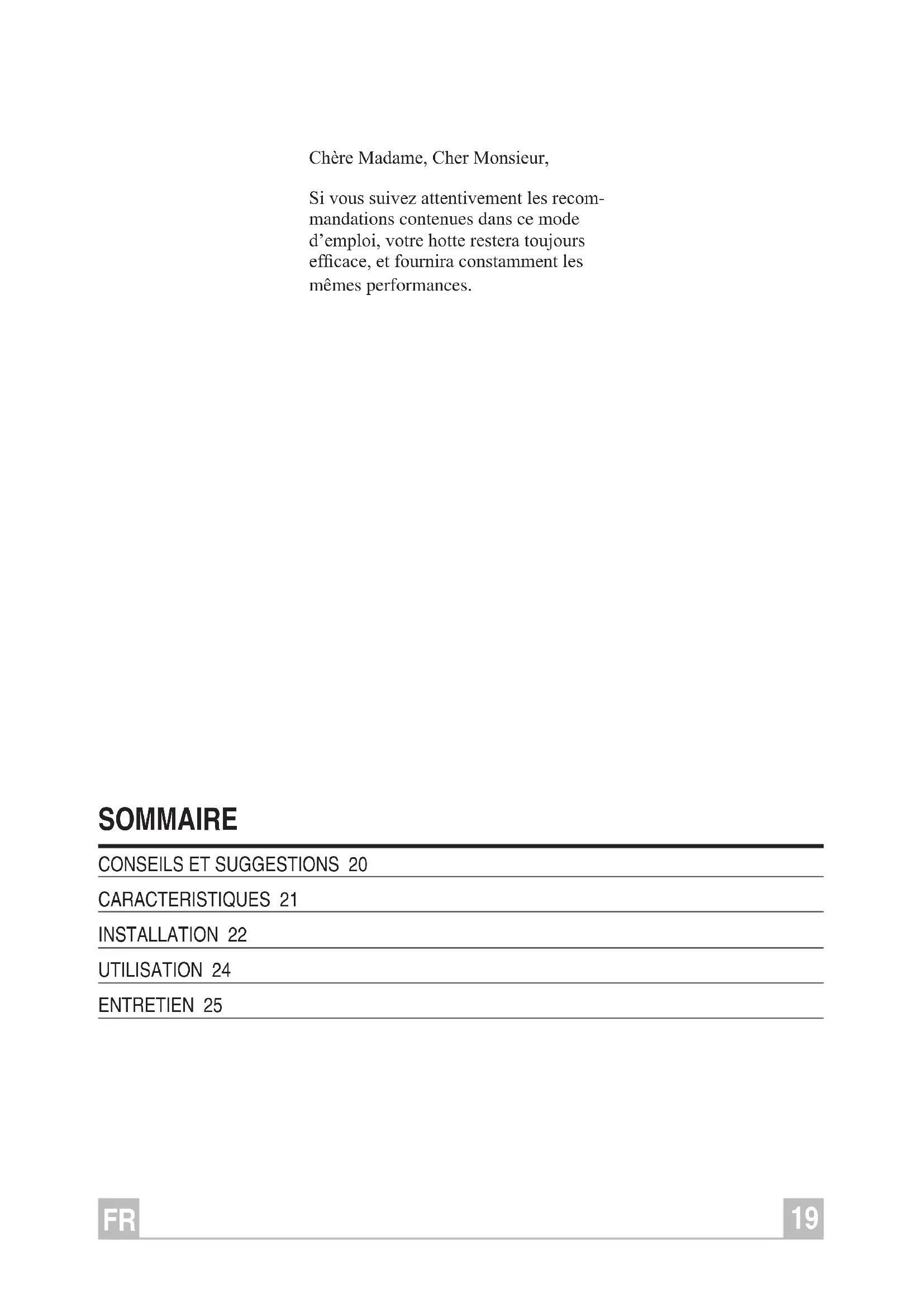 SOMMaIRE Chère Madame, Cher Monsieur, Si vous suivez attentivement les recom- mandations contenues dans ce mode d’emploi, votre hotte restera toujours efcace, et fournira constamment les mêmes performances.