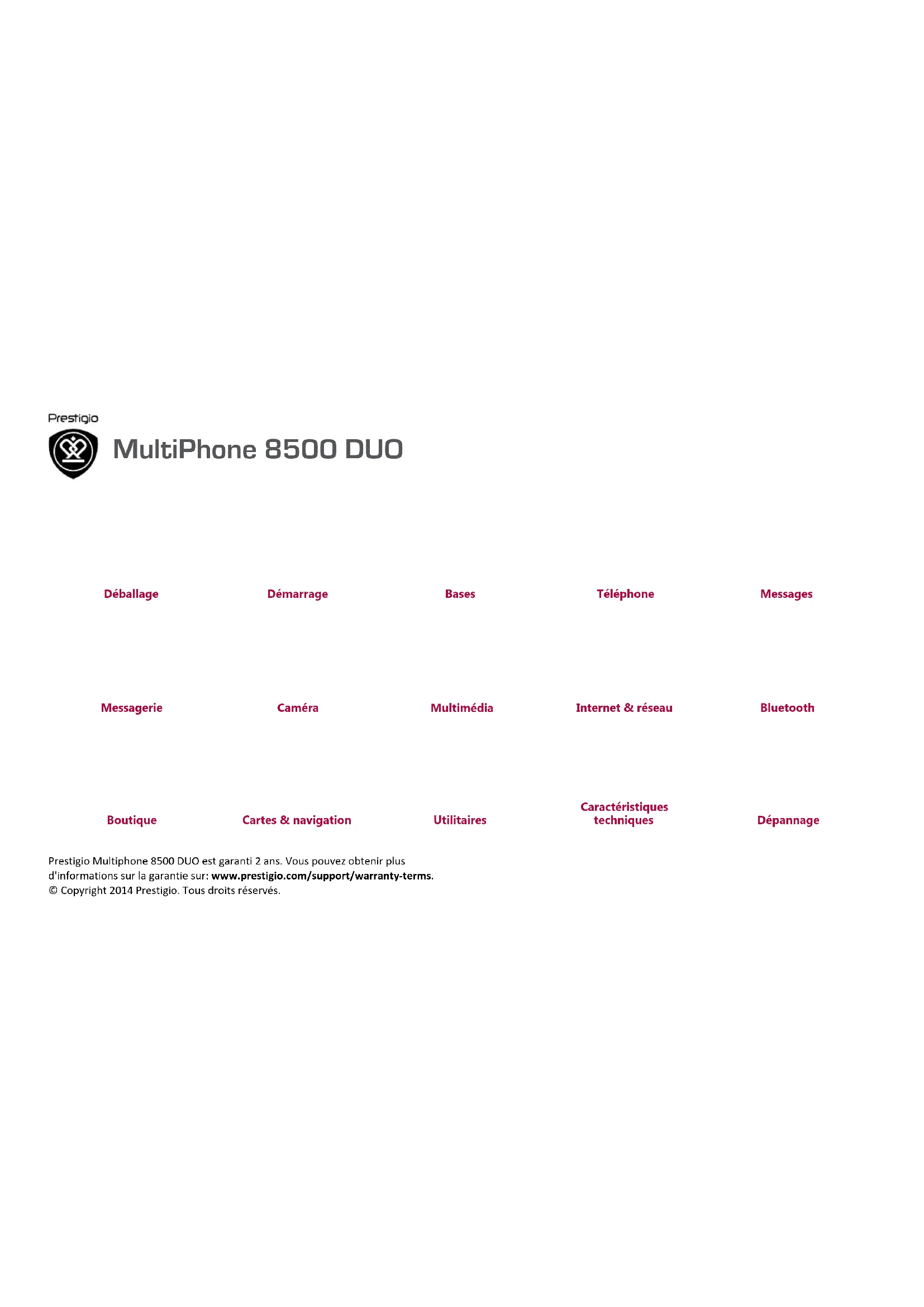 Prestigio Multiphone 8500 DUO est garanti 2 ans. Vous pouvez obtenir plus d'informations sur la garantie sur: www.prestigio.com/support/warranty-terms. © Copyright 2014 Prestigio. Tous droits réservés. MultiPhone 8500 DUO Déballage Démarrage Bases Téléphone Messages Messagerie Caméra Multimédia Internet & réseau Bluetooth Boutique Cartes & navigation Utilitaires Caractéristiques techniques Dépannagewww.prestigio.com Déballage Dans votre colis
