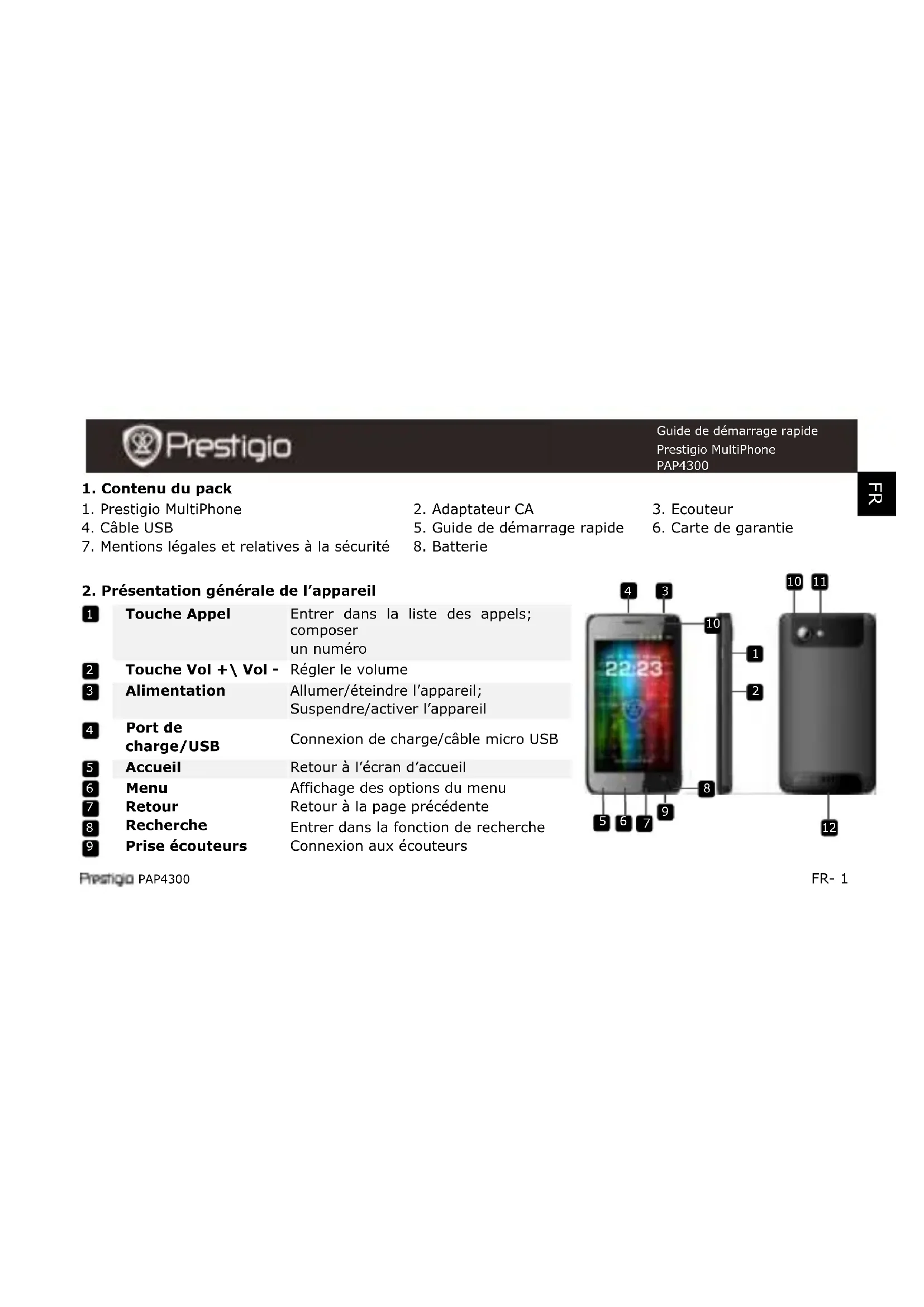 Presser et maintenir la Touche d’alimentation pendant quelques secondes. L’écran d’Accueil apparaîtra automatiquement après l’écran de démarrage. Presser la Touche d’alimentation une fois pour passer en mode veille et la presser à nouveau pour réactiver l’appareil. Presser et maintenir la Touche d’alimentation puis appuyer sur Eteindre pour éteindre l’appareil.PAP4300 FR - 5 Guide de démarrage rapide Prestigio MultiPhone PAP4300