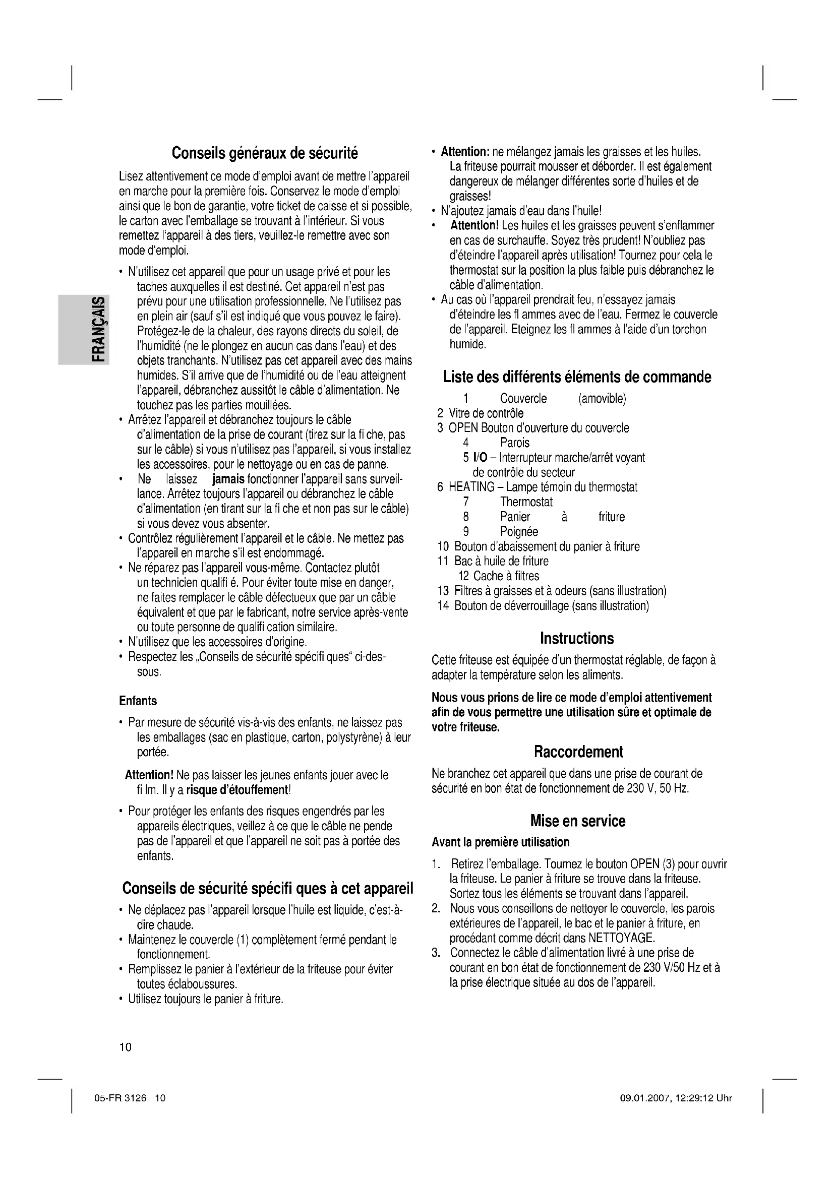 - Au cas où l’appareil prendrait feu, n’essayez jamais d’éteindre les fl ammes avec de l’eau. Fermez le couvercle de l’appareil. Eteignez les fl ammes à l’aide d’un torchon humide. Liste des différents éléments de commande 1 Couvercle (amovible) 2 Vitre de contrôle 3 OPEN Bouton d’ouverture du couvercle 4 Parois 5 I/O – Interrupteur marche/arrêt voyant de contrôle du secteur 6 HEATING – Lampe témoin du thermostat 7 Thermostat 8 Panier à friture 9 Poignée 10 Bouton d’abaissement du panier à friture 11 Bac à huile de friture 12 Cache à fi ltres 13 Filtres à graisses et à odeurs (sans illustration) 14 Bouton de déverrouillage (sans illustration) Instructions Cette friteuse est équipée d’un thermostat réglable, de façon à adapter la température selon les aliments. Nous vous prions de lire ce mode d’emploi attentivement afi n de vous permettre une utilisation sûre et optimale de votre friteuse. Raccordement Ne branchez cet appareil que dans une prise de courant de sécurité en bon état de fonctionnement de 230 V, 50 Hz. Mise en service Avant la première utilisation