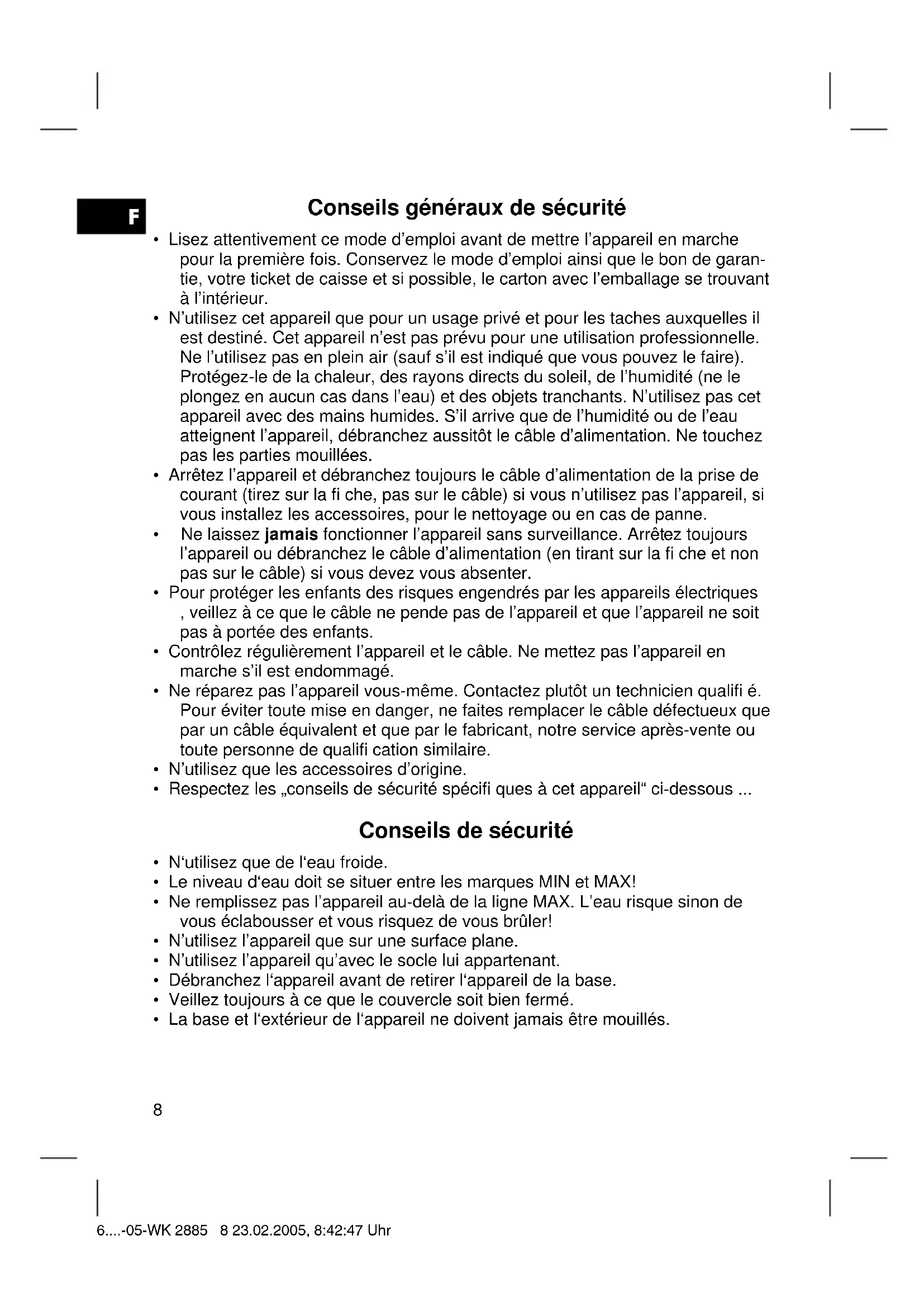 - La base et l‘extérieur de l‘appareil ne doivent jamais être mouillés. 6....-05-WK 2885 8 23.02.2005, 8:42:47 UhrF