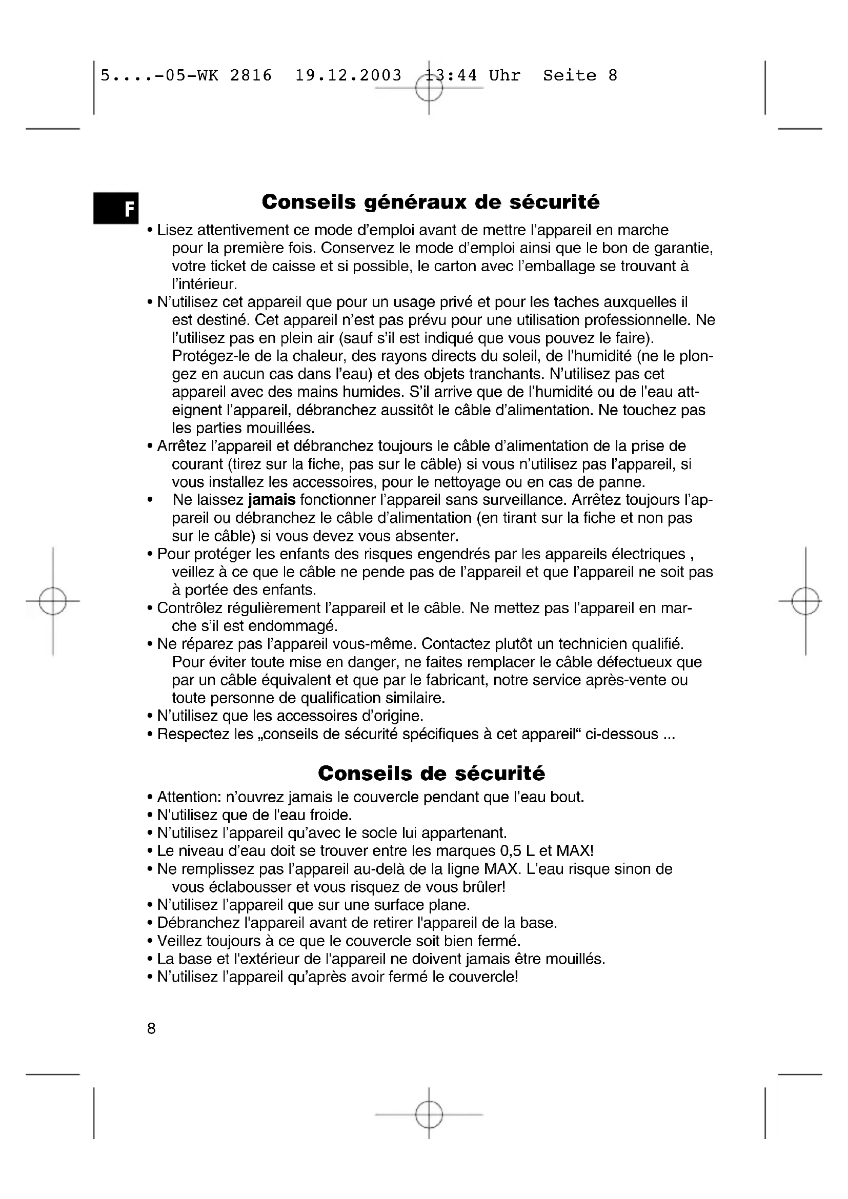 5....-05-WK 2816 19.12.2003 13:44 Uhr Seite 8Avant la première utilisation Faîtes bouillir, 2 fois avant la première utilisation, de l'eau fraîche sans détergent. N’utilisez en aucun cas cet eau.