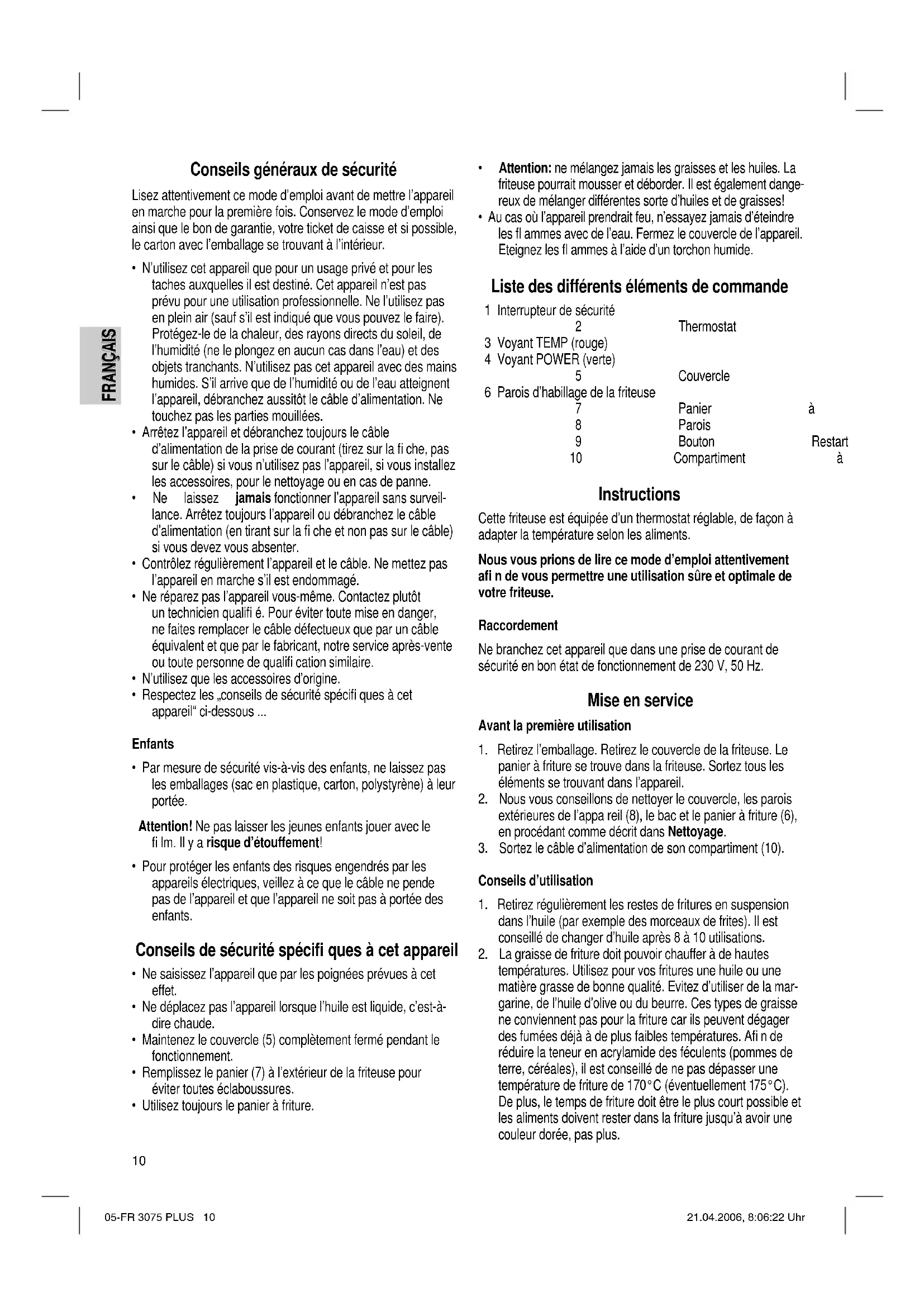 - Si vous mettez votre appareil par erreur en marche lorsqu’il ne contient pas d’huile ni matière grasse, la sécurité anti- surchauffe est automatiquement activée. L’appareil n’est alors plus prêt au fonctionnement. Débranchez le câble d’alimentation. 05-FR 3075 PLUS 11 21.04.2006, 8:06:25 Uhr12 FRANÇAIS FRANÇAIS