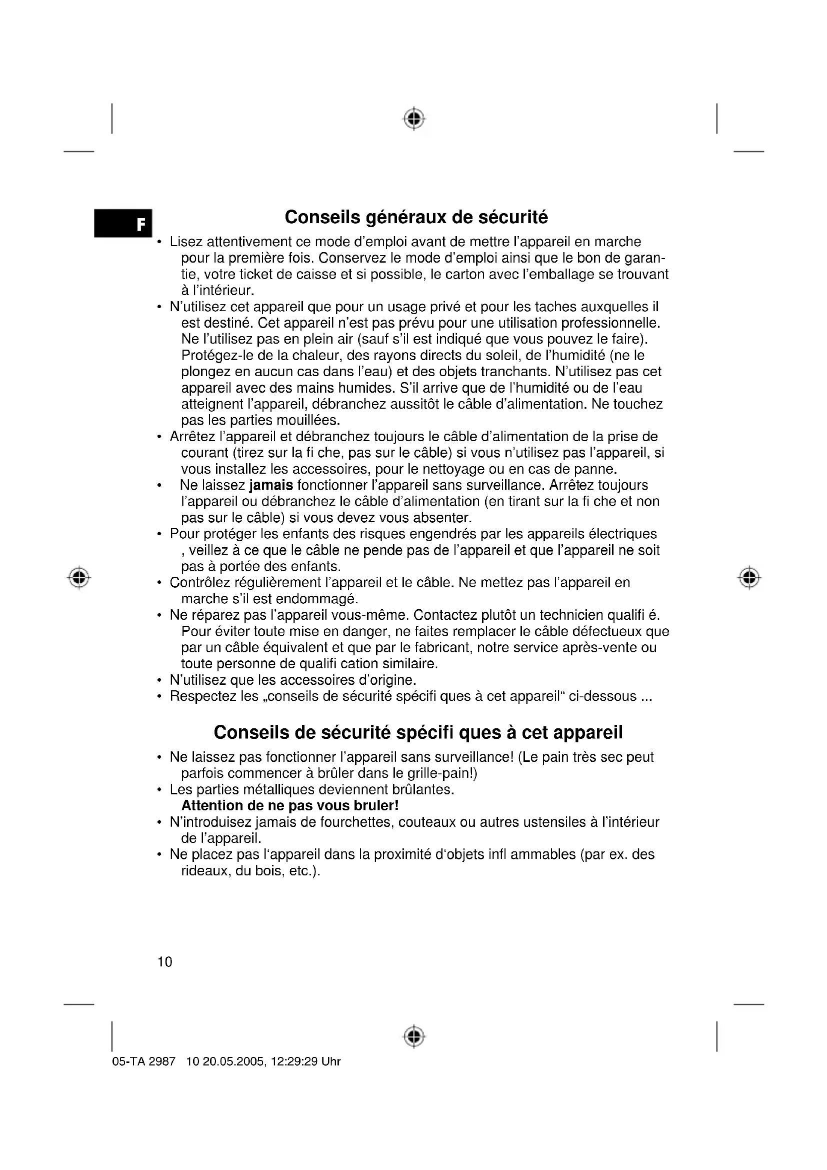 einte, un signal sonore retentit et l’appareil s’arrête automatiquement. Retirez alors les grilles amovibles de l’appareil. L’appareil est équipé de parois froides „cool touch“. Pendant l’utilisation, les par- ties métalliques accessibles de l’appareil sont néanmoins très chaudes. Laissez l’appareil refroidir avant de le ranger. 05-TA 2987 11 20.05.2005, 12:29:29 UhrF